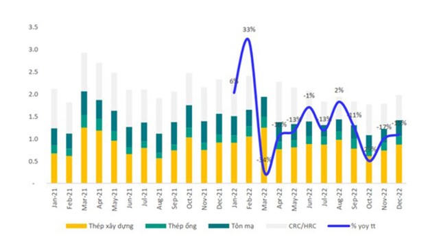 Lũy kế quý I/2023, sản xuất thép thành phẩm đạt hơn 6,69 triệu tấn, giảm 20,9% so với cùng kỳ; bán hàng thép thành phẩm đạt hơn 6 triệu tấn, giảm 25,4% so với cùng kỳ (trong đó, xuất khẩu hơn 1,65 triệu tấn, giảm 8,9% so với cùng kỳ).