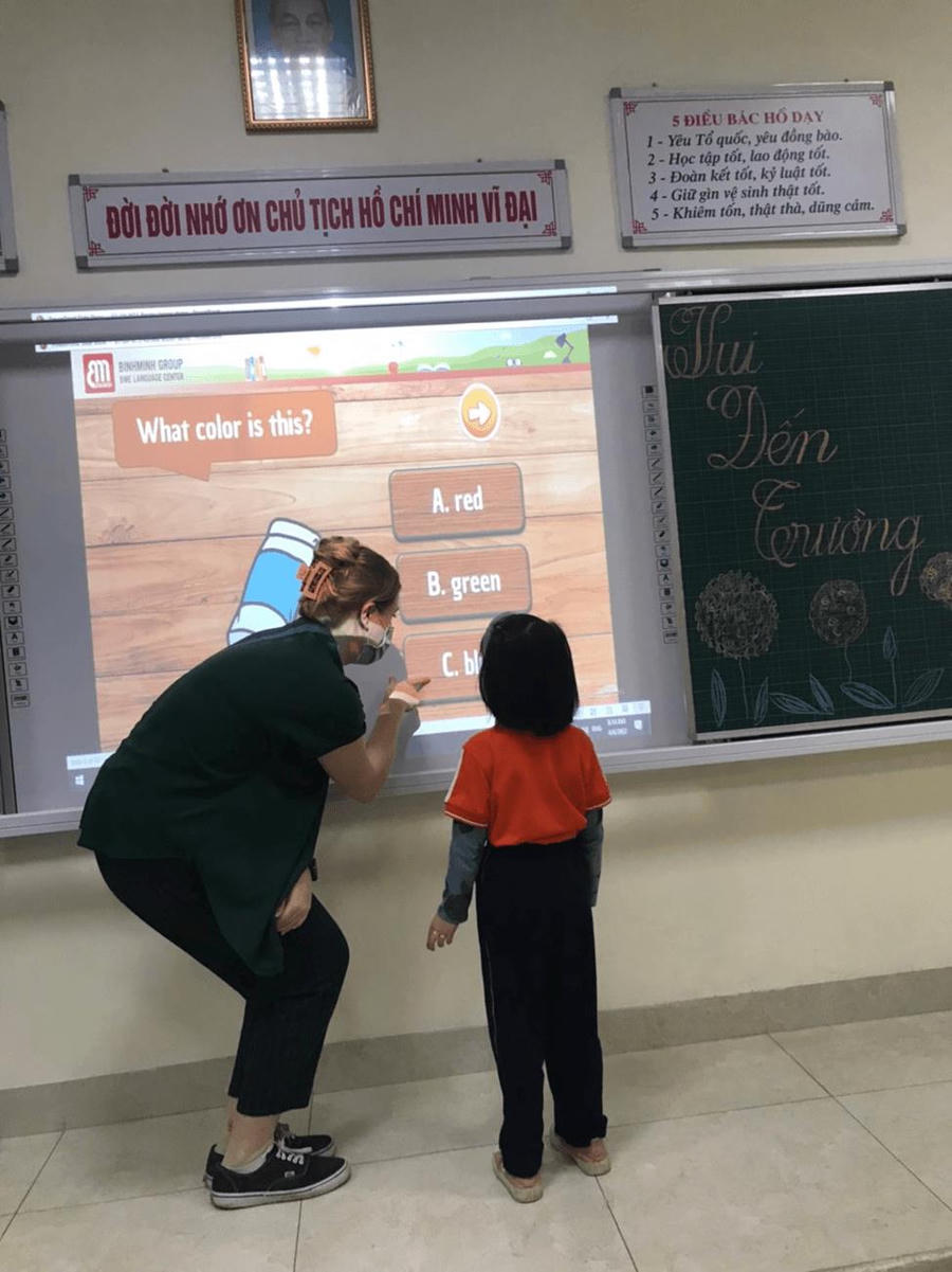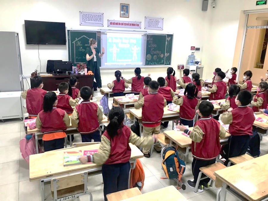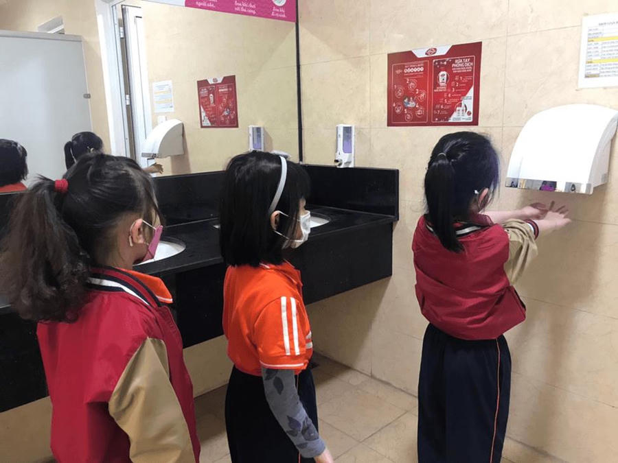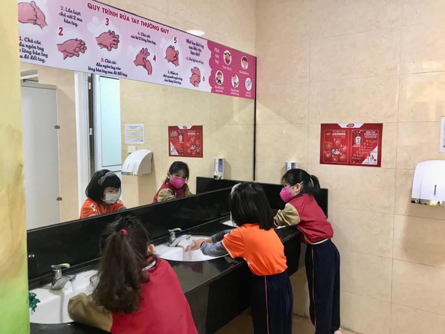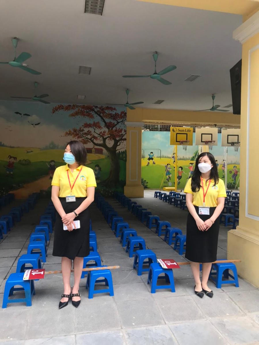 Thầy cô cũng mong chờ được đón các con. Thầy cô đón các con từ cổng trường, hướng dẫn các con đo thân nhiệt, rửa tay sát khuẩn.
