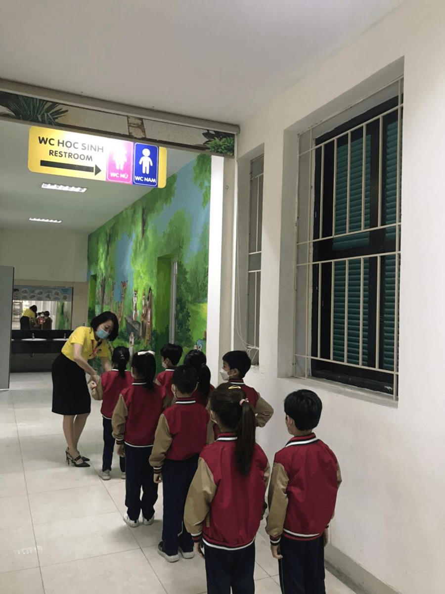 Hôm nay là ngày đầu tiên các con lớp 1 được đến trường Tiểu học. Các con được các cô giáo ân cần hướng dẫn những kỹ năng cơ bản, quan trọng và cần thiết. Cô giáo chỉ dẫn cho các con về khu vực nhà vệ sinh của trường, cách vệ sinh và rửa tay đúng cách.