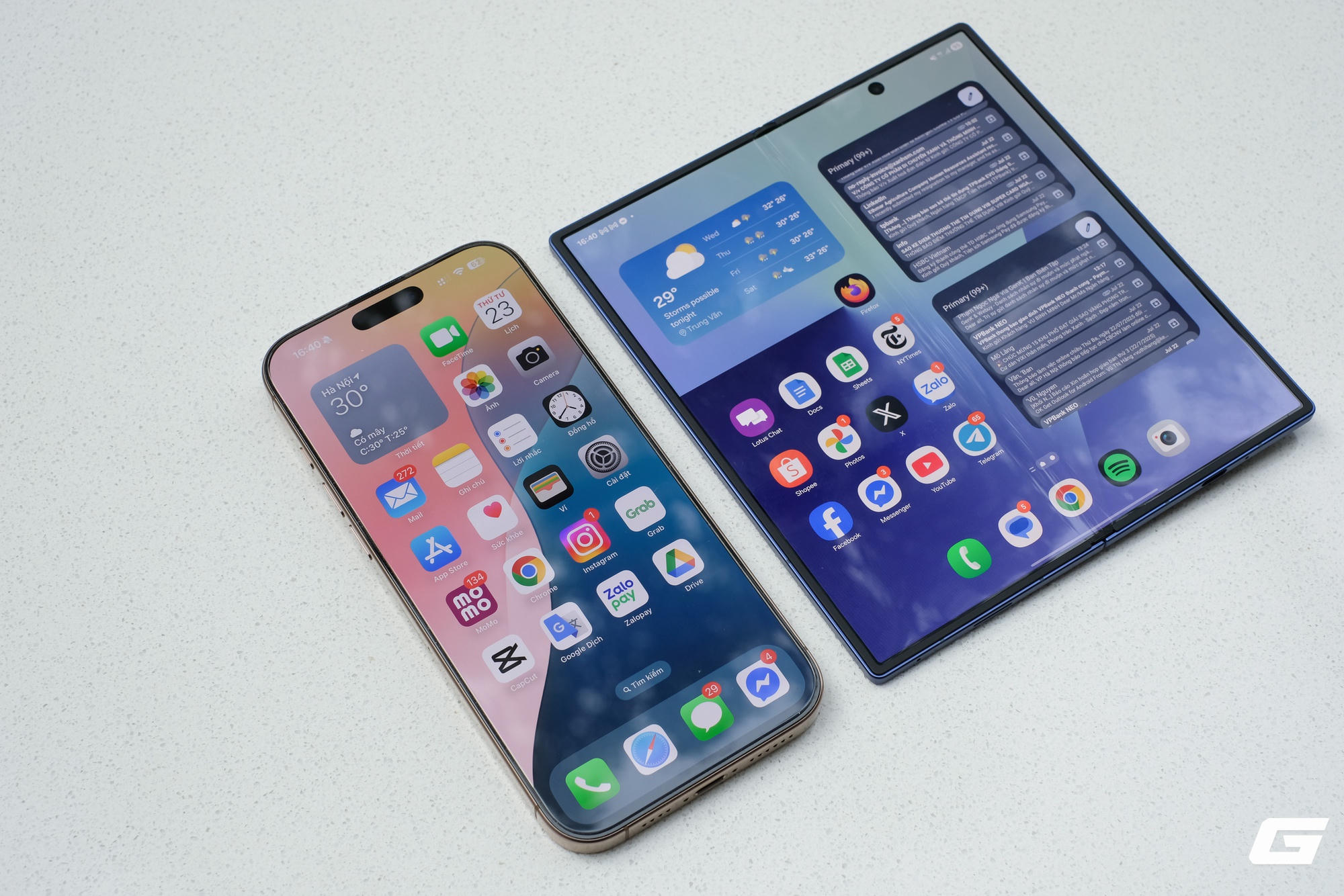 Về phía Samsung, dòng Galaxy Z Fold7 và Z Flip7 tiếp tục tập trung vào cải tiến thiết kế mỏng nhẹ, trải nghiệm và tích hợp AI. Galaxy Z Fold7 có độ mỏng 8,9 mm khi mở - tương đương iPhone 16 Pro Max (8,3mm) - nhưng lại nhẹ hơn cả mẫu iPhone dạng thanh cao cấp này dù tích hợp màn hình gập lớn hơn. Ngoài ra, máy sử dụng chip Snapdragon 8 Elite for Galaxy, camera 200MP tương tự Galaxy S25 Ultra và hỗ trợ Galaxy AI. Trong khi đó, Galaxy Z Flip7 nâng cấp màn hình phụ FlexWindow 4,1 inch, cho phép gọi trợ lý Gemini Live mà không cần mở máy.