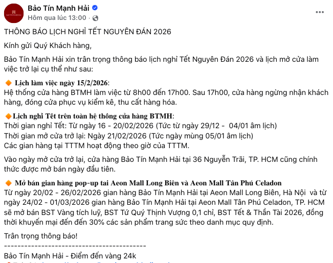 Theo thông báo từ Tập đoàn Phú Quý, doanh nghiệp này áp dụng lịch nghỉ Tết cho toàn bộ hệ thống tại Hà Nội và TP.HCM bắt đầu từ ngày 14/2 (tức 27 tháng Chạp). Thời gian giao dịch trở lại được ấn định vào Chủ nhật, ngày 22/2 (tức mùng 6 tháng Giêng).