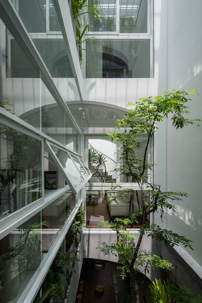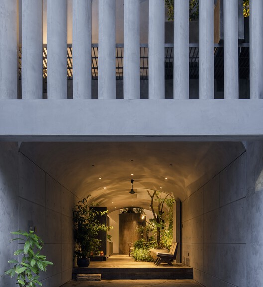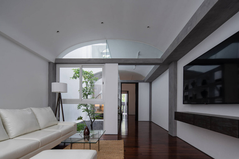 Sự kết hợp giữa cấu trúc vòm cùng vật liệu bê tông và vườn cây trong nhà mang lại một không gian bình yên, tĩnh lặng, đáp ứng nhu cầu về một không gian sống hòa hợp với thiên nhiên đất trời.