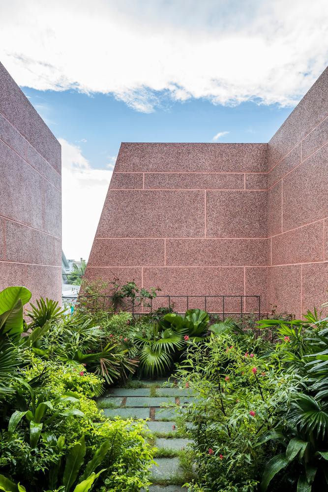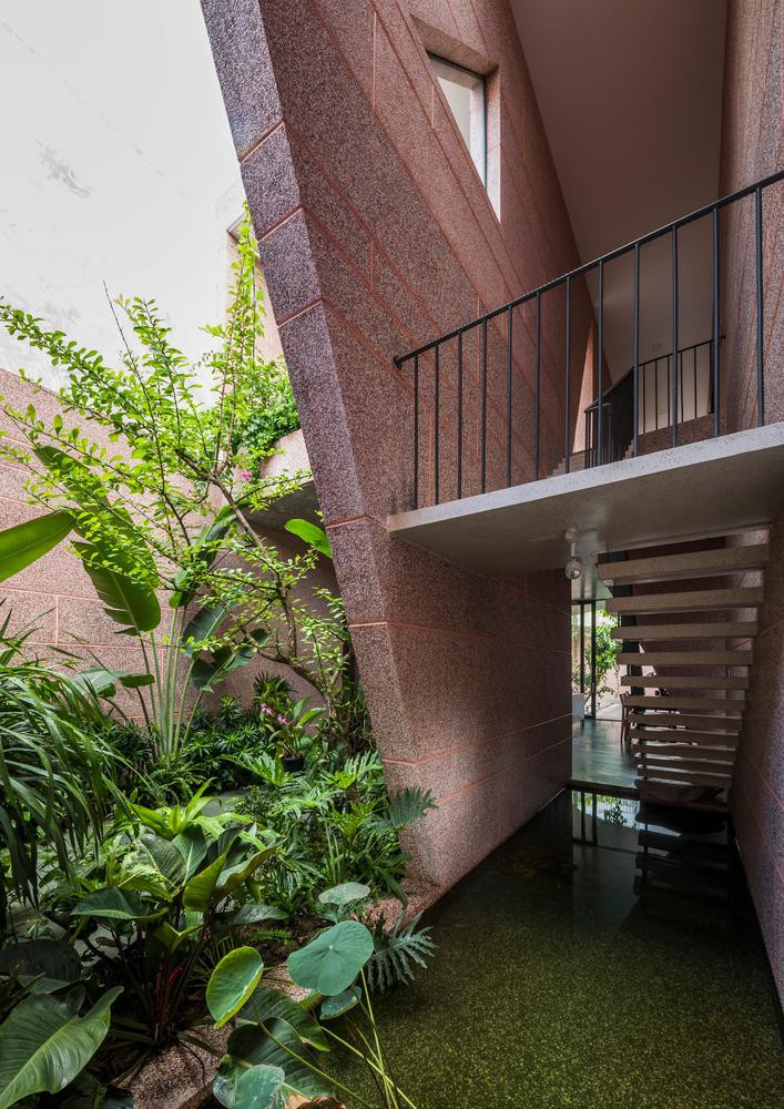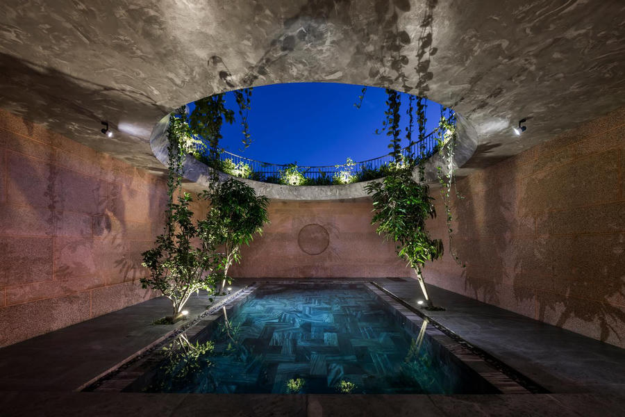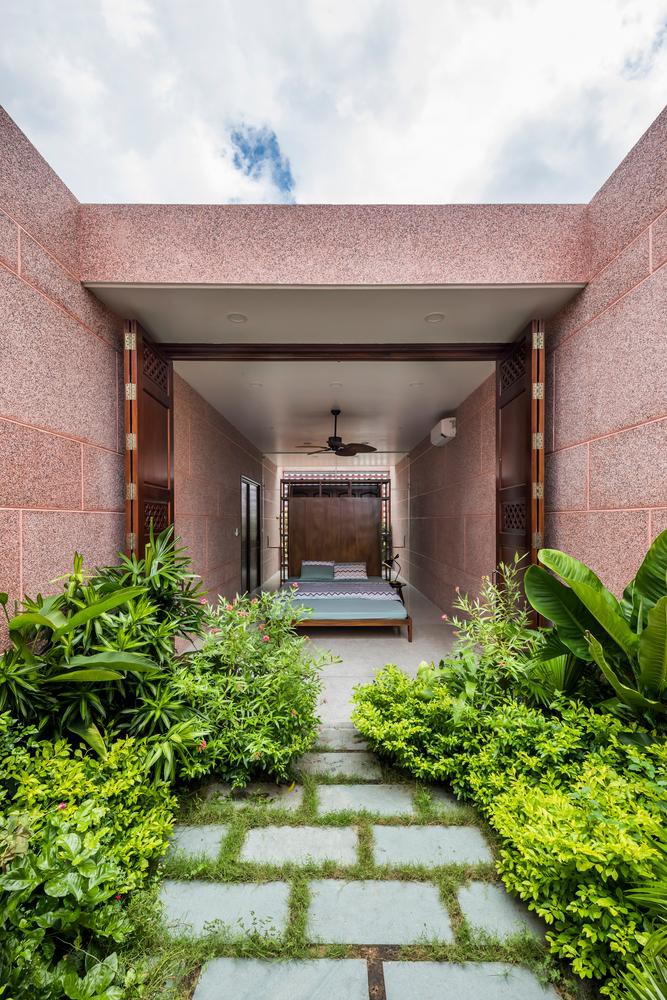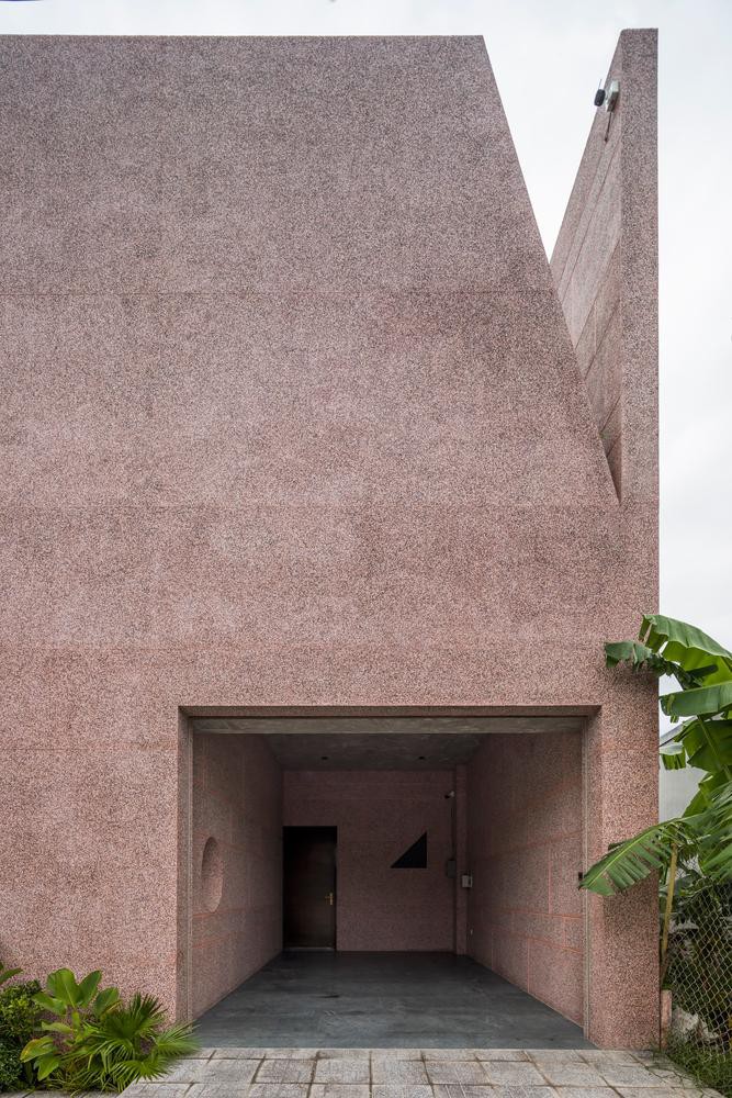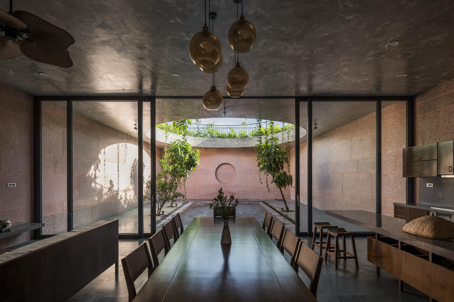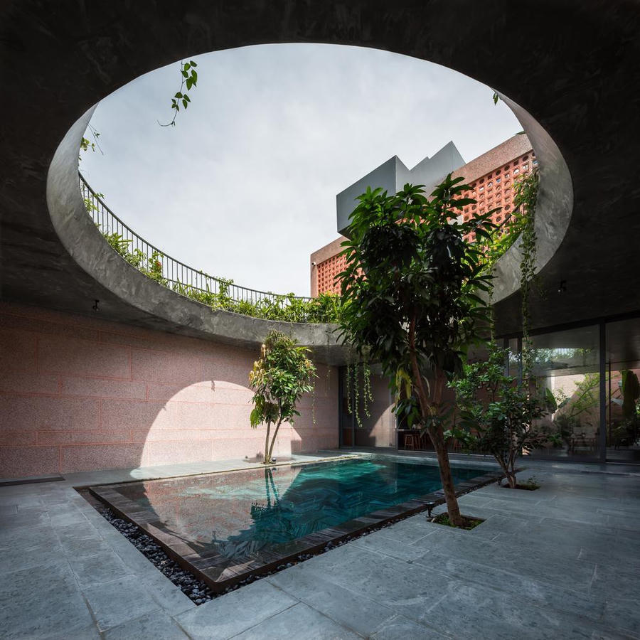 Ngôi nhà màu hồng rộng 290m2 này được thiết kế dành riêng cho 2 chị em gái ở Long Xuyên, An Giang.Do gia chủ muốn sống trong ngôi nhà yên tĩnh với nhiều không gian mở, nên các kiến trúc sư đã thiết kế công trình tập trung khai thác nhiều mảng ánh sáng và sự chuyển tiếp trong không gian sốnghiện đại.Công trình được thiết kế theo trục đứng của mặt bằng. Không gian được phân tách thành các lớp khác nhau bằng vật liệu đá granit màu hồng đồng nhất cả phía bên trong và bên ngoài, giúp làm mờ mọi ranh giới.Điểm nhấn của căn biệt thự là bể bơi nằm dưới khoảng giếng trời lớn. Tùy vào thời gian trong ngày, ánh nắng chiếu qua khoảng mở sẽ liên tục thay đổi vị trí, lúc ở bể bơi, lúc ở trần tầng trệt, tạo sự thú vị cho giác quan.Ẩn giấu trong những chùm dây leo rơi xuống từ tầng 2 là chiếc cầu thang dẫn lên tầng 2 với khu vườn tươi xanh.Cầu thang giữa nhà nằm trên một hồ nước nông, giúp không gian luôn mát mẻ và có chiều sâu khi hình bóng của mọi vật chiếu xuống mặt nước.Mỗi góc khuất trong ngôi nhà đều được giới kiến trúc thiết kế khéo léo, tinh tế vừa giúp chủ nhân dùng làm nơi chiêm nghiệm, vừa là không gian để tận hưởng những giá trị thiên nhiên.Phòng khách và khu bếp ăn được liên kết với nhau, hướng ra hồ bơi, nơi chuyển tiếp ánh sáng giữa ngày và đêm.Trước mỗi phòng ngủ là khu vườn nhỏ với đủ loại cây xanh, giúp chủ nhân luôn luôn gần gũi với thiên nhiên, qua đó giải tỏa stress.Để tầm nhìn không bị giới hạn, các không gian chung đều sử dụng cửa kính trượt.Biệt thự tạo ra nhiều khoảng mở hình tròn lớn giúp kết nối ngôi nhà với bầu trời, ẩn chứa hàm ý ẩn dụ sâu xa, đó là đứng trước thiên nhiên rộng lớn, con người luôn cảm thấy nhỏ bé.