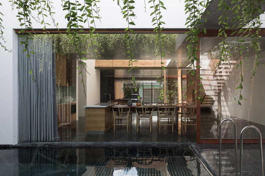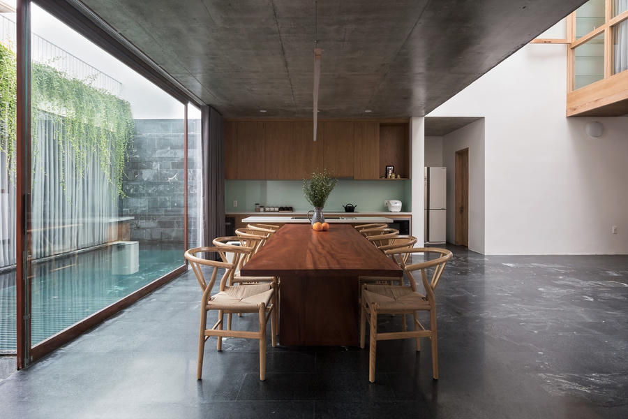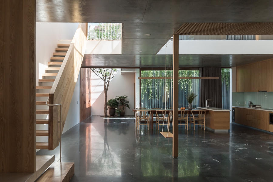 Khung bê tông cốt thép được chọn làm lớp vỏ kết cấu chính cho ngôi nhà nhằm giảm tác động của các hiện tượng thời tiết khắc nghiệt. Vật liệu gỗ kết hợp cùng bê tông, thêm nhiều cây xanh ở các không gian đem lại cảm giác nhẹ nhàng, bình yên.