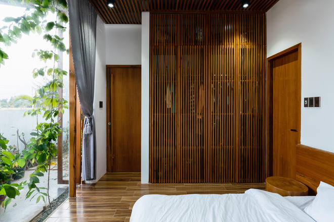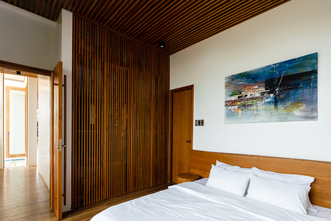 Không gian yên tĩnh nằm ở hình khối phía sau bao gồm ba phòng ngủ và hai nhà vệ sinh.