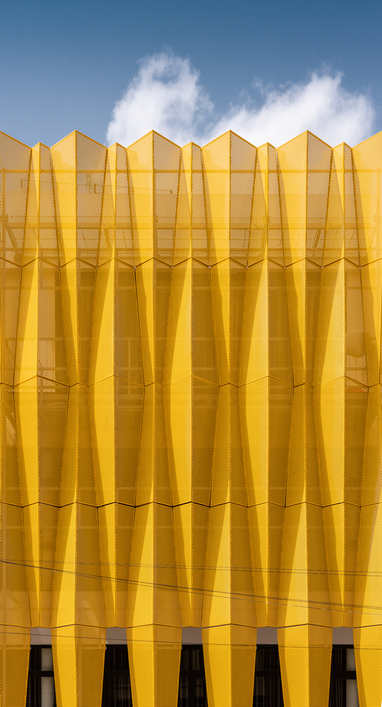 Vật liệu này được thiết kế vừa là một tấm màn bền vững cho tấm kính phía sau giúp tiết kiệm năng lượng, vừa tạo ấn tượng mạnh cho người xem.