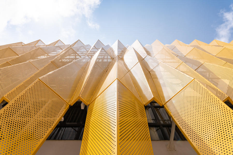 Để giải quyết ảnh hưởng nhiệt độ cao gây ra bởi ánh nắng mặt trời chiếu thẳng vào tòa nhà, giới kiến trúc sư đã thiết kế cấu trúc kép gồm các bức tường kính và tấm nhôm đục lỗ bằng đồ họa.