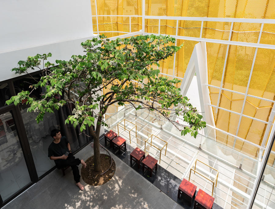 Dù tách biệt về không gian sử dụng, độc lập về lối đi nhưng cả công trình vẫn có sự kết nối, giao thoa bởi không gian chung là khoảng không và sân vườn.