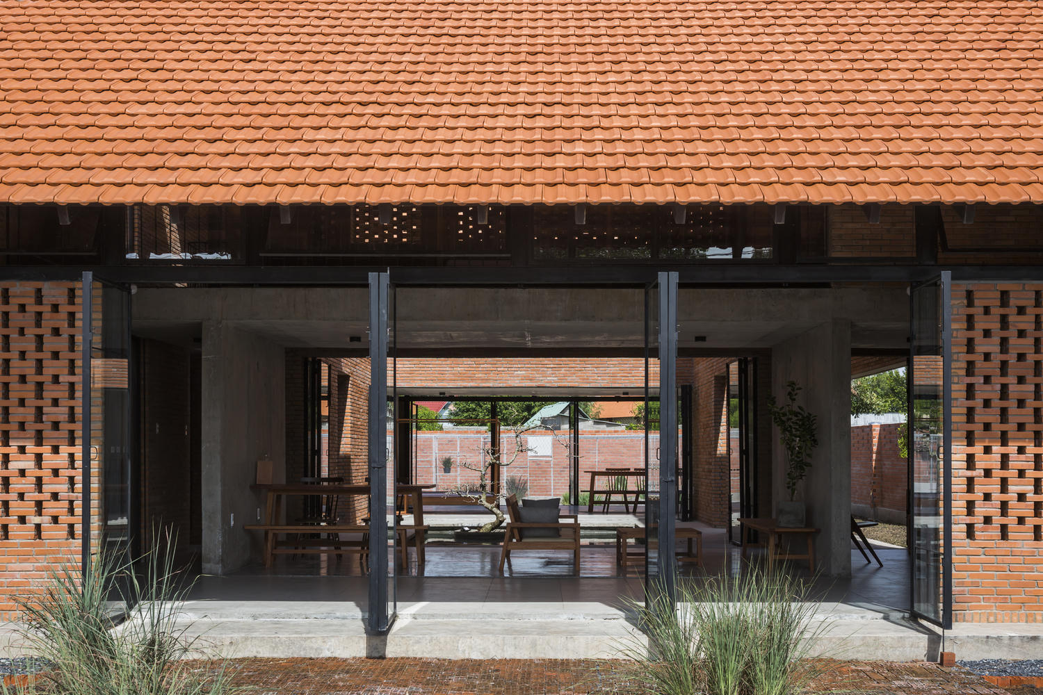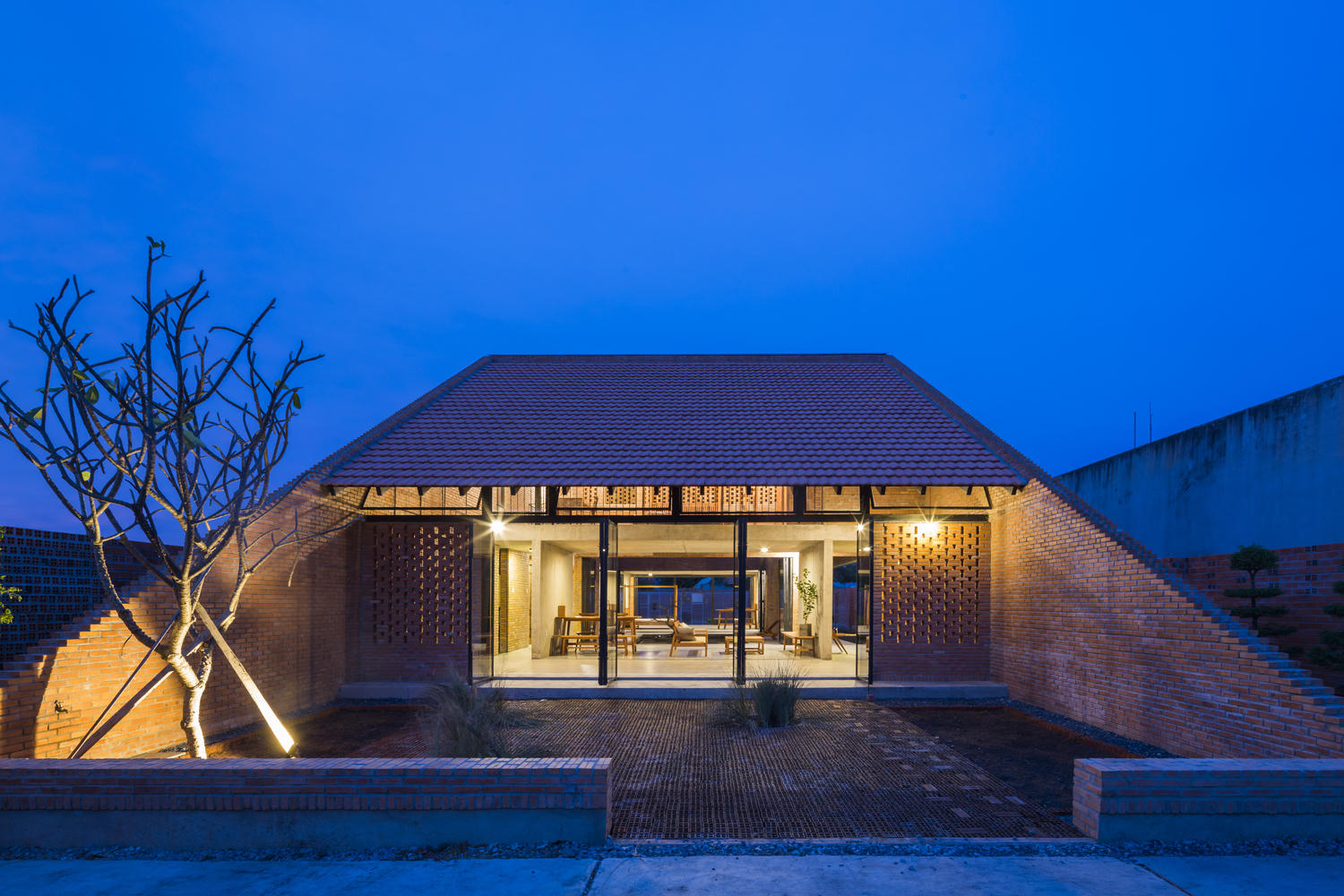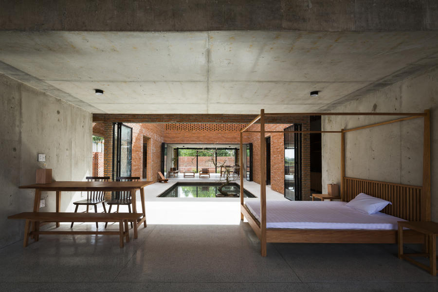 Bằng cách này, ngôi nhà có sân trong rộng và những bức tường lớn làm từ gạch đặc, có xen kẽ khoảng trống để đón gió. Sân trước được lát từ gạch ống, có thể thấm nước mưa.