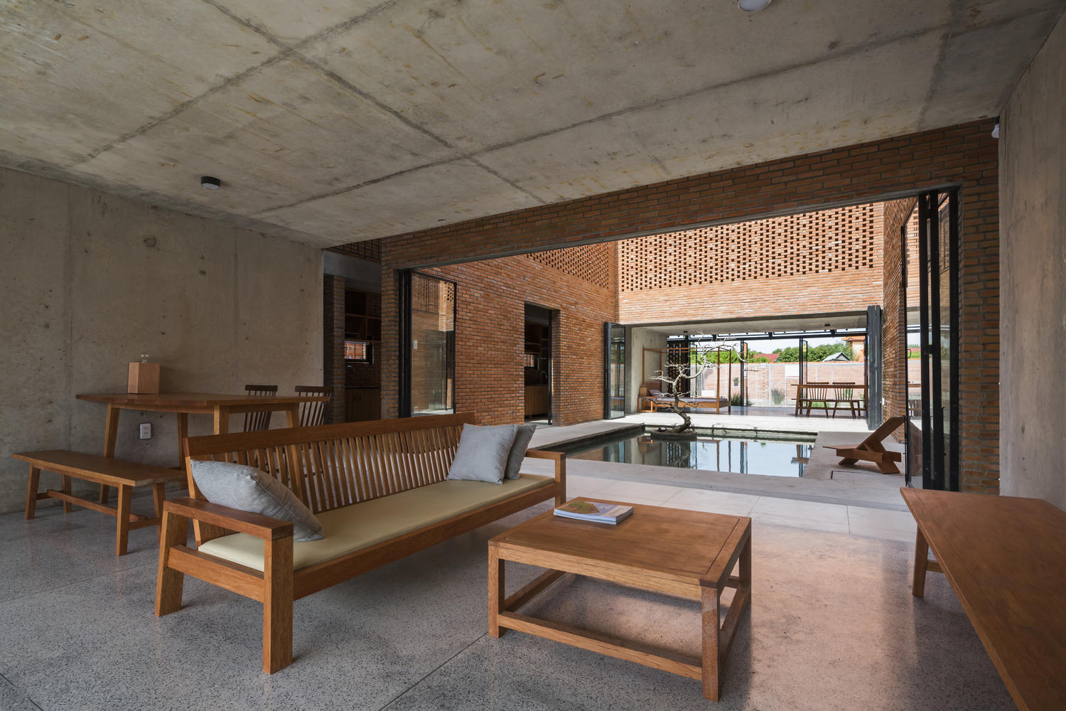 Các kiến trúc sư mong muốn có một không gian liên hoàn giữa các chức năng trong và ngoài ngôi nhà, để các thành viên có thể thoải mái vui chơi, vận động mà không bị gò bó bởi những bức tường ngăn cách.