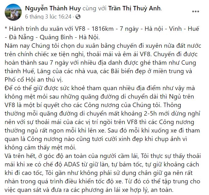 Cũng dành nhiều lời khen cho hệ thống ADAS, trong hành trình du xuân xuyên nửa đất nước với chiếc VF 8 hồi đầu tháng 3, anh Nguyễn Thành Huy thừa nhận thực sự thoải mái với các tính năng như giữ làn, tự bám tốc, tự giữ khoảng cách khi đi cao tốc. Đây cũng là các tính năng khiến rất nhiều người dùng đánh giá cao những mẫu xe điện VinFast vượt trội so với xe xăng cùng phân khúc.