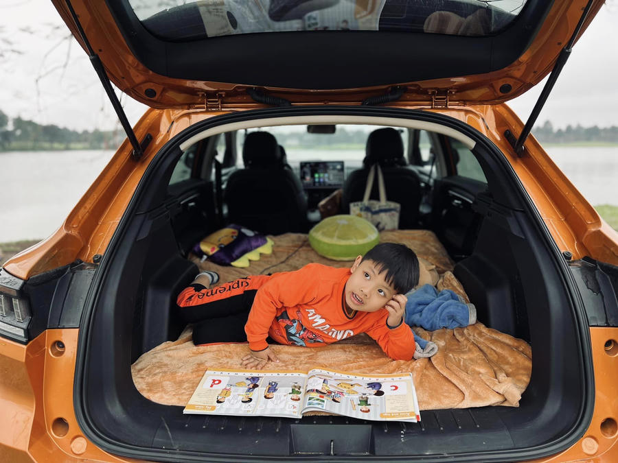 Ngoài ra, VF 8 có khoang lái rộng thênh thang nên khi xe dừng, bé Gấu có thể thoải mái lộn nhào, trèo từ đằng trước ra đằng sau, tha hồ nghịch ngợm. Hàng ghế sau của chiếc VF 8 có thể ngả phẳng nên cứ có cơ hội là bé Gấu sẽ mang chăn, gối lên xe nằm ngủ, như một chiếc giường di động.