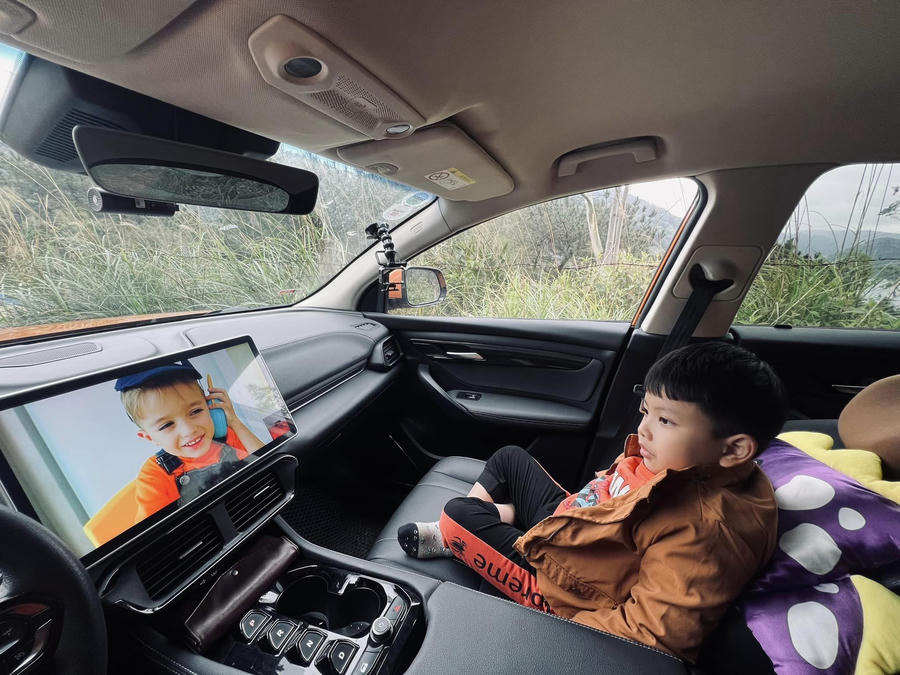 Đối với Gấu, chiếc xe như một “vương quốc” riêng của mình, bởi trong xe có màn hình 15,6 inch “to đùng” với hệ thống âm thanh 8 loa, khiến cậu bé trầm trồ “xem hoạt hình thích hơn trên tivi của ông nội”. Lúc nào chán hoạt hình, Gấu lại mở game mà VinFast đã trang bị trên xe chơi rất “lành nghề”. Đôi lúc yêu đời, hai bố con mở Spotify trên Apple CarPlay được kết nối không dây với điện thoại, ngồi thư giãn trong xe.