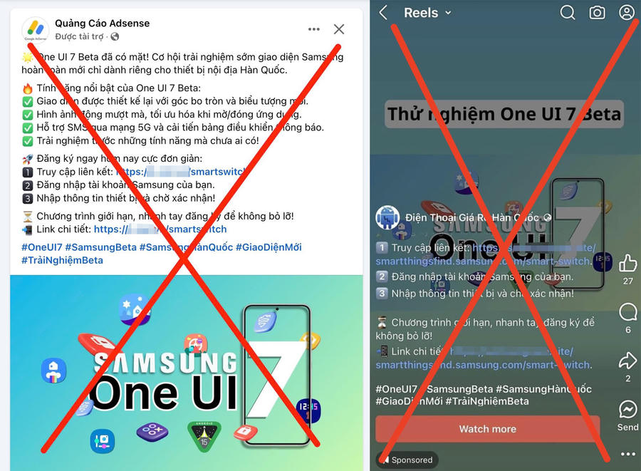Nắm bắt tâm lý muốn trải nghiệm sớm tính năng mới, MXH Facebook thời gian qua đã xuất hiện một số bài đăng "chào mời" người dùng đăng ký trải nghiệm sớm One UI 7 Beta. Các bài đăng này chủ yếu tìm đến người dùng thông qua phương thức chạy quảng cáo nhắm đối tượng (targeted ads), hoặc đôi khi là được chia sẻ trong một số hội nhóm.