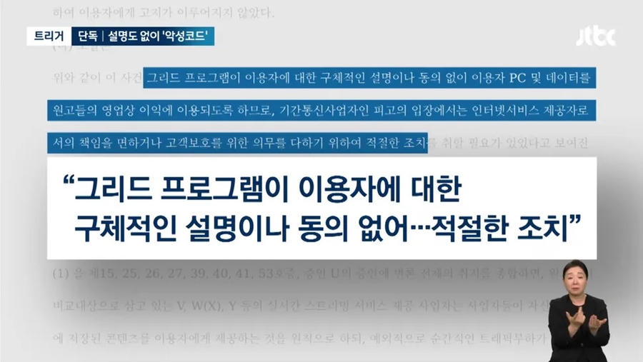 Theo báo cáo, KT cho biết họ đã trực tiếp cài đặt phần mềm độc hại trên các khách hàng sử dụng dịch vụ Grid của Webhard vì đây là một chương trình độc hại và "họ không còn lựa chọn nào khác ngoài việc kiểm soát nó." Tuy nhiên, vấn đề chính ở đây không phải là việc Webhard sử dụng giao thức BitTorrent mà là việc cài đặt phần mềm độc hại trên máy tính của khách hàng mà không có sự đồng ý.