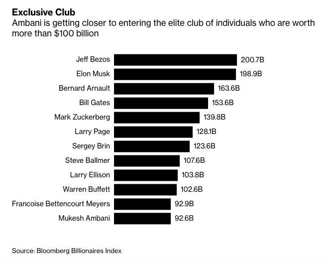 Với khối tài sản 92,6 tỷ USD, tỷ phú Mukesh Ambani đang tiến gần hơn vị trí thành viên câu lạc bộ những người sở hữu tài sản 100 tỷ USD trở lên.