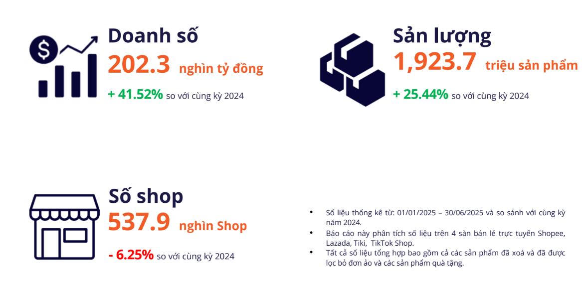 Tính 6 tháng đầu năm 2025, ghi nhận doanh số bán hàng trên 4 sàn chính gồm Shopee, Lazada, Tiki và TikTok Shop đạt 202.300 tỷ đồng (khoảng 7,7 tỷ USD), tăng gần 42% so với cùng kỳ năm trước.