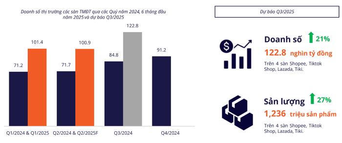 Theo dự báo của Metric.vn, doanh số TMĐT trong quý III có thể đạt 122.800 tỷ đồng, sản lượng tiêu thụ vào khoảng 1,236 triệu sản phẩm. So với quý trước, mức tăng lần lượt đạt 21% về doanh số và 27% về sản lượng, cho thấy đà phục hồi và mở rộng của thị trường tiếp tục được duy trì.