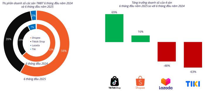 TikTok Shop xếp sau nhưng đã tăng từ 29% lên 39% thị phần, cho thấy đà mở rộng mạnh mẽ của mô hình "giải trí - mua sắm tích hợp".