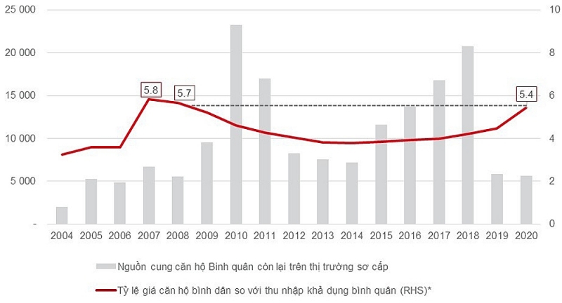 Tuy nhiên, tỷ lệ giá bán phân khúc này so với thu nhập bình quân không ngừng tăng lên trong 5 năm qua, đạt 5,4% vào năm 2020, gần tới ngưỡng kỷ lục là 5,8% vào năm 2007.