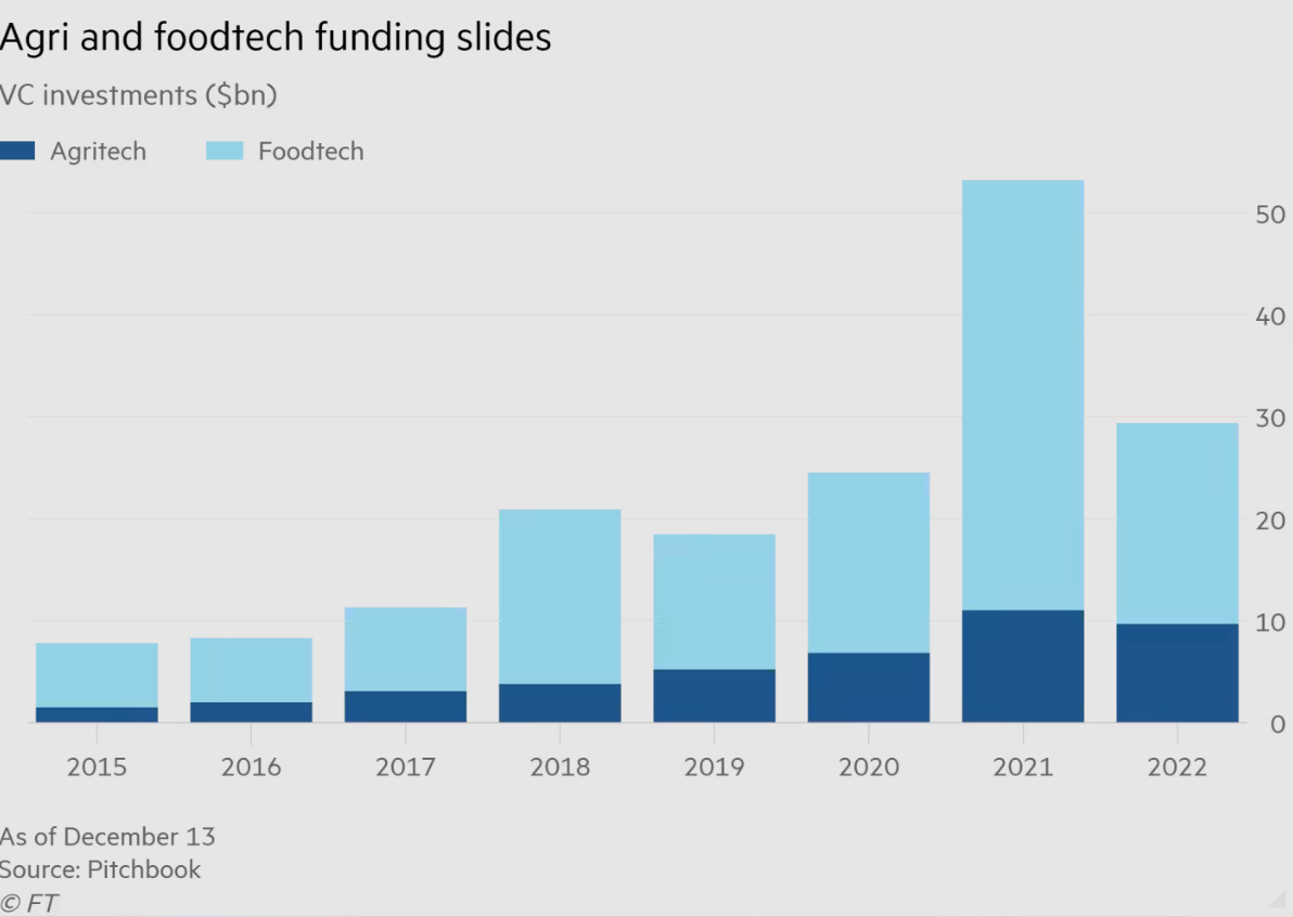 Dữ liệu từ Pitchbook cho thấy, mức giảm đầu tư vào công nghệ nông nghiệp và công nghệ thực phẩm năm 2022 mạnh hơn so với tất cả các lĩnh vực khác. Tình trạng sụt giảm mạnh về tài chính xảy ra khi nhiều startup phải vật lộn với sự gia tăng chi phí lao động, năng lượng và các đầu vào khác.