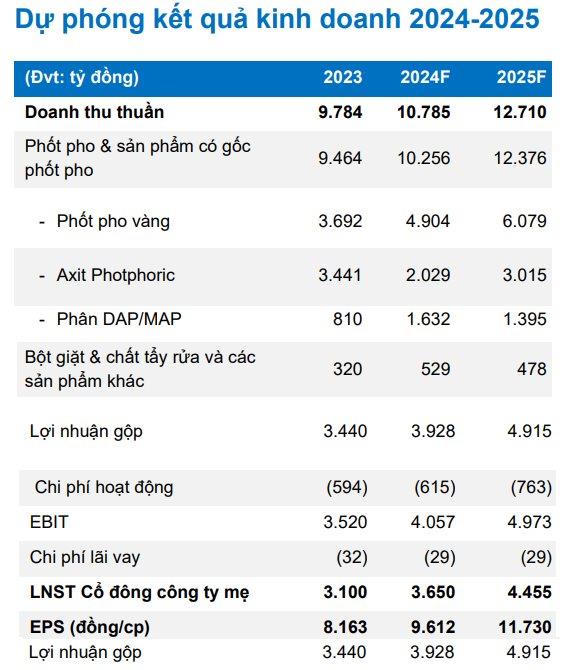 Với năm 2025, doanh thu thuần dự phóng đạt 12.710 tỷ đồng và lãi ròng xấp xỉ 4.500 tỷ. Ước tính lợi nhuận gộp có thể tăng 33% trong 2025 nhờ doanh nghiệp đẩy mạnh xuất khẩu sản phẩm phốt pho vàng có độ tinh khiết hơn và được cấp giấy phép khai thác sản lượng quặng gấp đôi tại khai trường 25 vào cuối năm 2024, từ đó nâng tỷ lệ tự chủ nguyên liệu đầu vào ở mức 100%.
