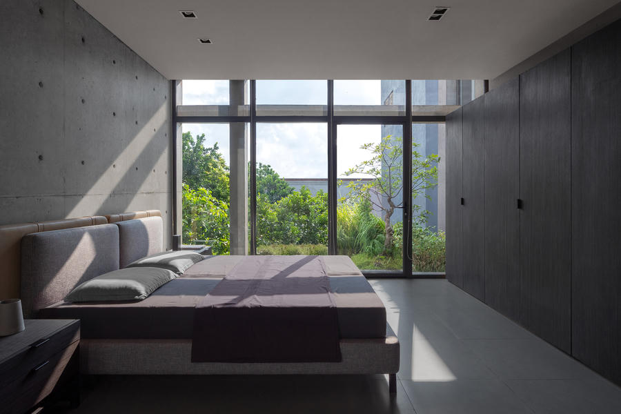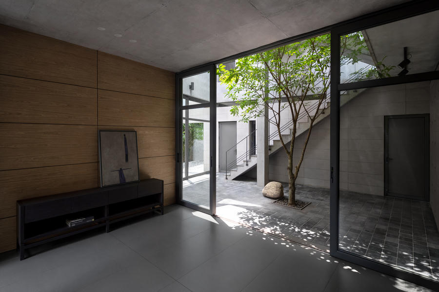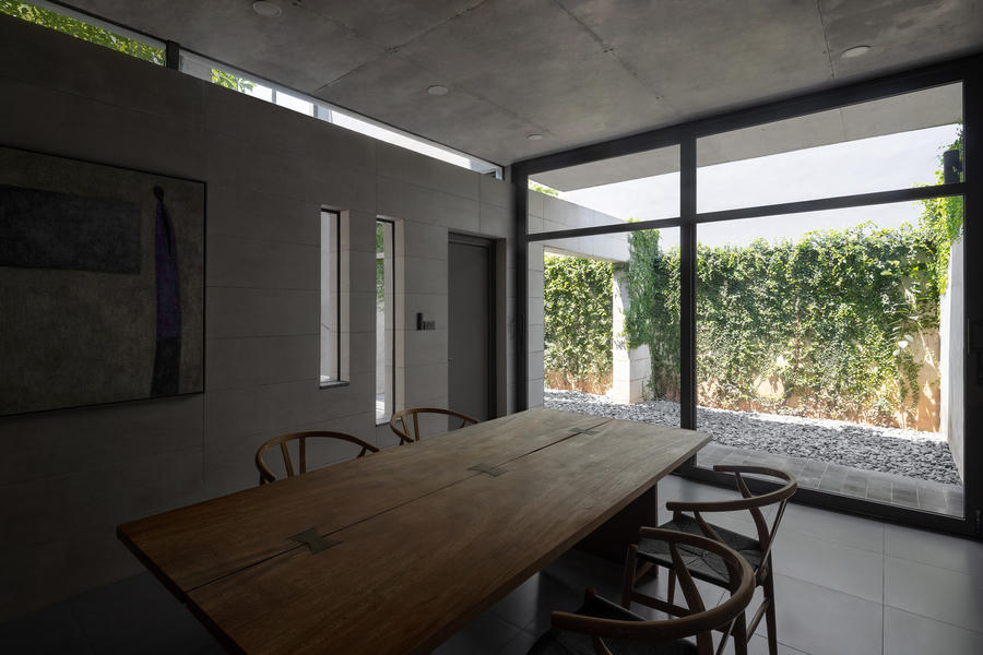 Để làm mát ngôi nhà vào mùa hè, mái nhà đã được thiết kế với một lớp vật liệu cách nhiệt gồm lớp lưới và đá được trải lên trên, tạo ra trần bê tông. Từ phòng khách, phòng ăn đến sân trong và sân sau, các kiến trúc sư đã sử dụng một tấm kính lớn để xóa nhòa ranh giới.