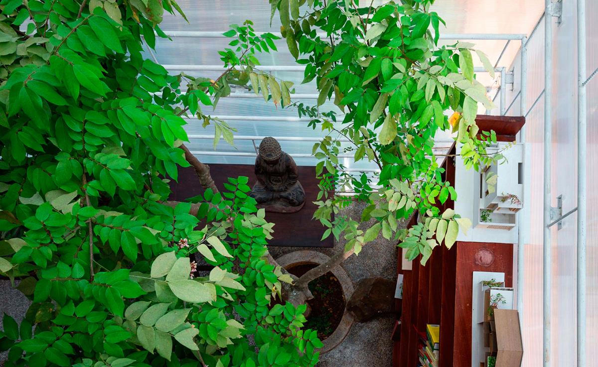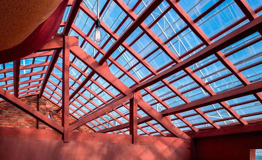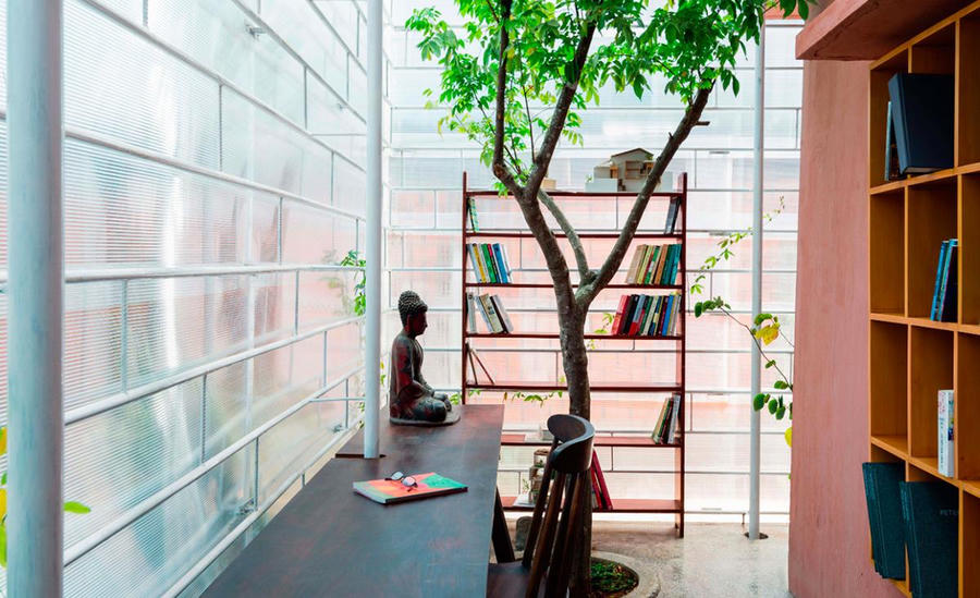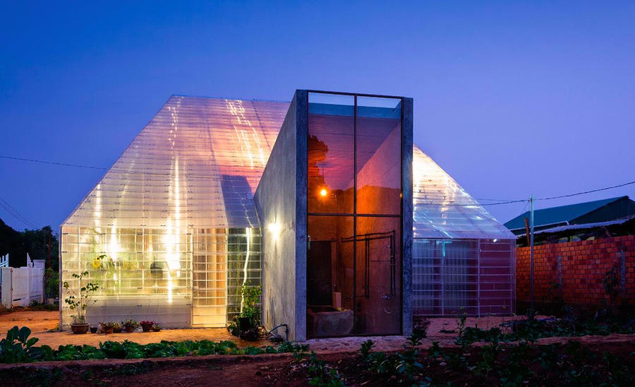 Tấm nhựa lợp polycarbonate được sử dụng bao bọc xung quanh, giúp khắc phục các khuyết điểm của ngôi nhà theo thời gian. Cấu trúc ngôi nhà cơ bản được giữ nguyên để lưu giữ ký ức, chỉ thêm không gian xanh.