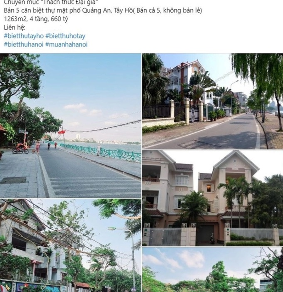Hay như 5 căn biệt thự mặt phố Quảng An, Tây Hồ (Hà Nội) với diện tích 1.263 m2, các căn đều xây dựng 4 tầng với tổng giá trị 660 tỷ đồng.Theo giới thiệu của môi giới, 5 căn biệt thự nằm ở những vị trí đắc địa, một mặt phố lớn Quảng An - bờ Hồ Tây, một mặt ngõ rộng. Khu vực có thể kinh doanh 24/24, ở siêu tiện ích, đẳng cấp “siêu tài phiệt”.