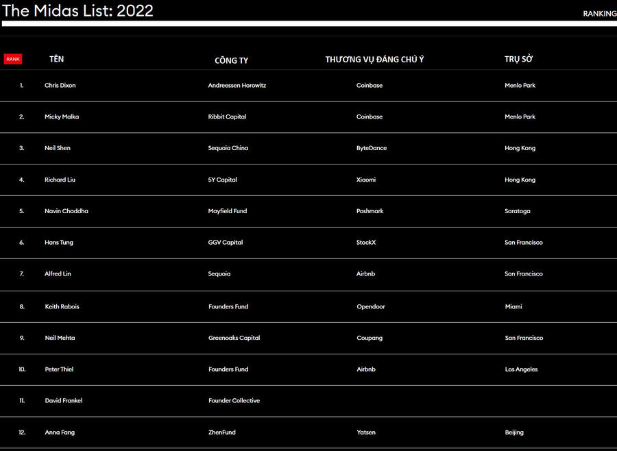 Anna Fang cũng không phải người phụ nữ duy nhất góp mặt trong Midas Seed. Kirsten Green, người sáng lập và đối tác quản lý tại Forerunner Ventures, và Ann Miura-Ko, đối tác đồng sáng lập tại Floodgate, đều giành được vị trí cao trong danh sách. Ngoài ra BXH còn có Jenny Lefcourt đến từ Freestyle Capital với danh mục đầu tư hạt giống ấn tượng bao gồm BetterUp, Embark và Airtable.