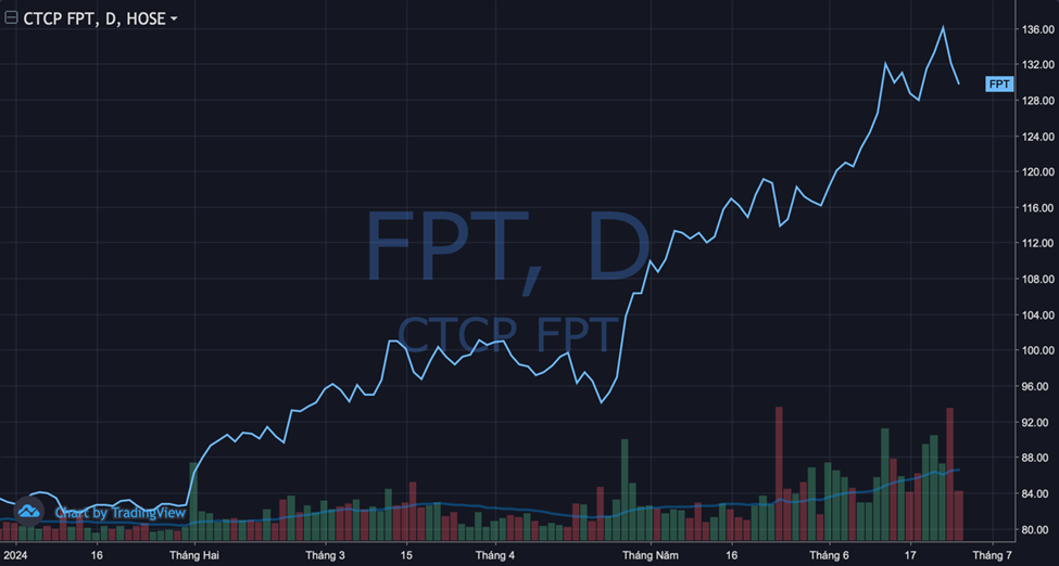 Sau thời gian miệt mài đi lên, cổ phiếu FPT lập đỉnh mới vào ngày 21/6 tại mức 136.100 đồng/cp (đã điều chỉnh) trước khi quay đầu giảm mạnh 2 phiên liên tiếp. FPT hiện đang giao dịch quanh mức 130.000 đồng/cp, vẫn cao hơn 55% so với đầu năm. Giá trị vốn hóa thị trường tương ứng ở mức 190.000 tỷ đồng.
