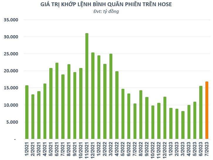 Sự gia tăng số lượng tài khoản mở mới đã góp phần giúp thị trường hồi phục mạnh trong tháng 7. VN-Index tăng tới hơn 9% cũng như thanh khoản trở nên sôi động hơn, nhiều phiên liên tục được đẩy lên ngưỡng kỷ lục mới. Riêng sàn HoSE, giá trị giao dịch khớp lệnh bình quân phiên cả tháng 7 đạt trên 16.700 tỷ đồng, tăng hơn 10% so với tháng trước và là mức cao nhất trong hơn một năm kể từ tháng 4/2022.