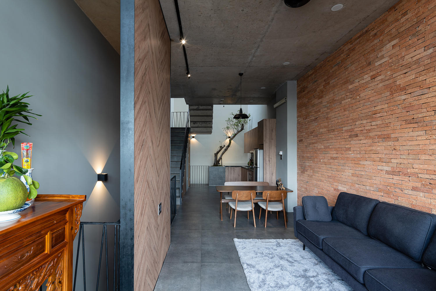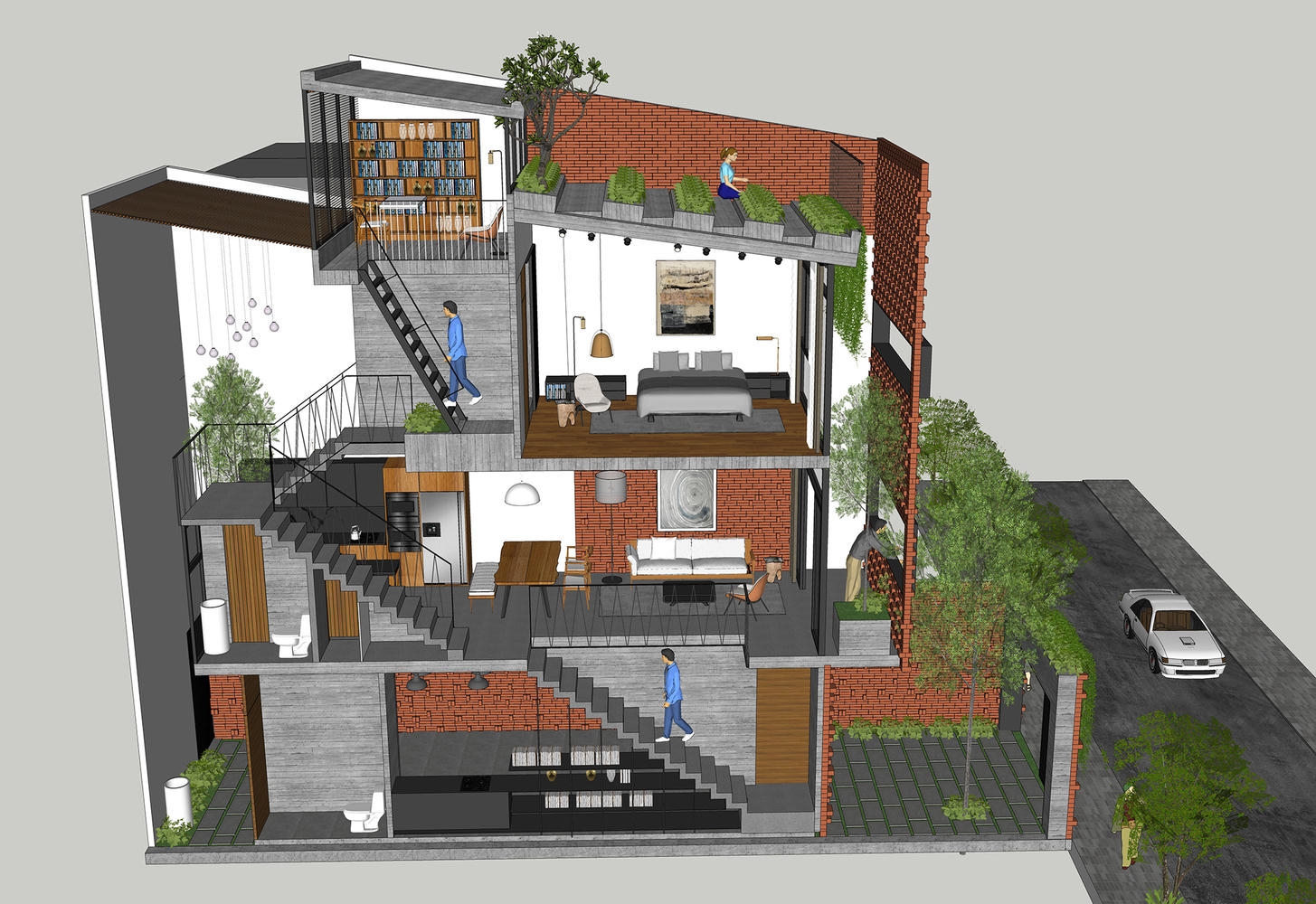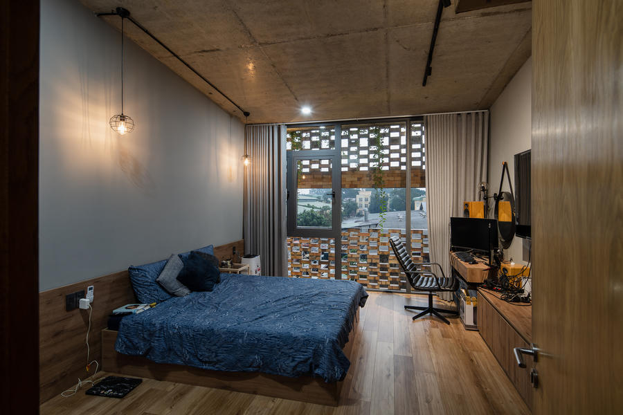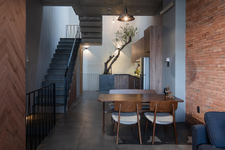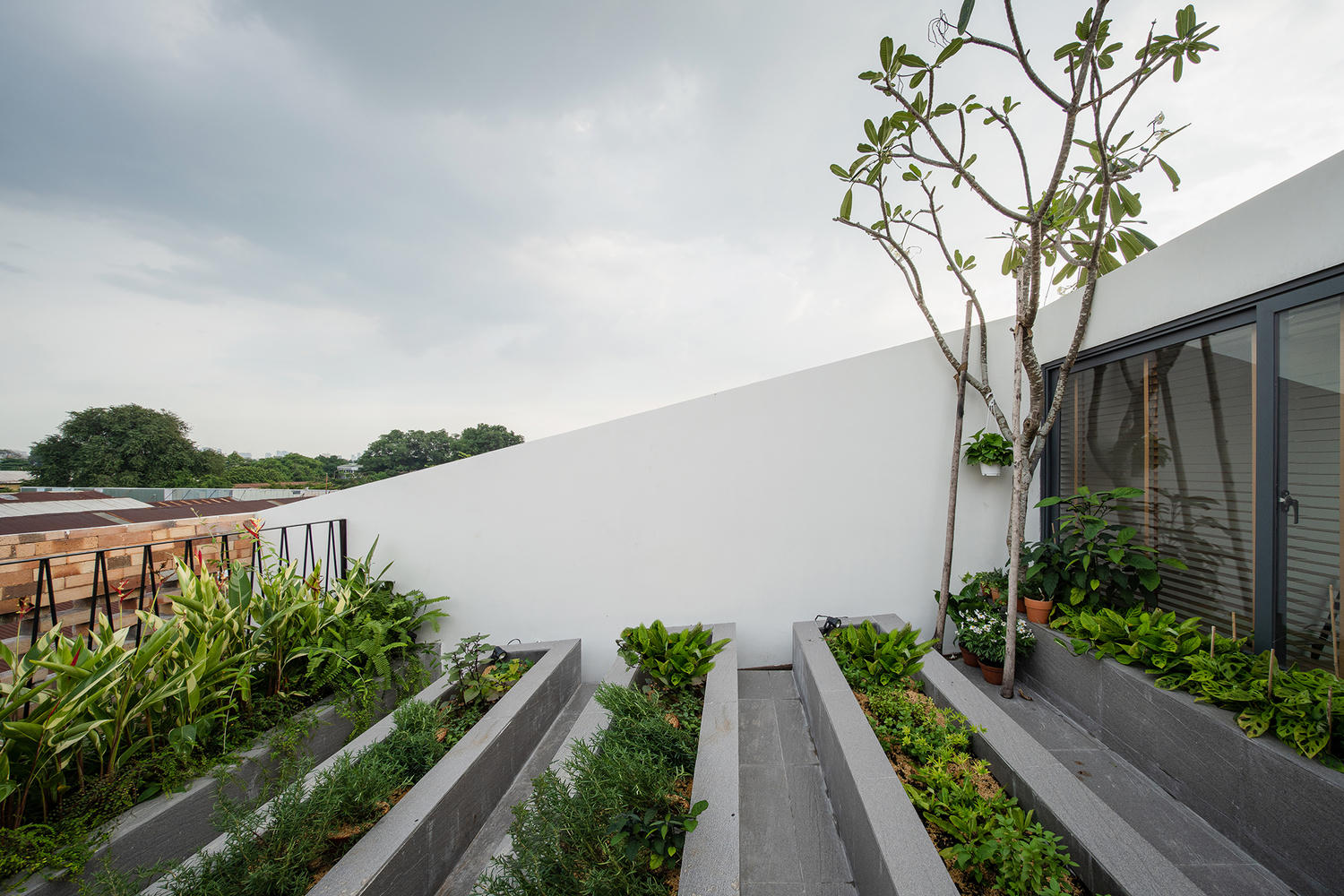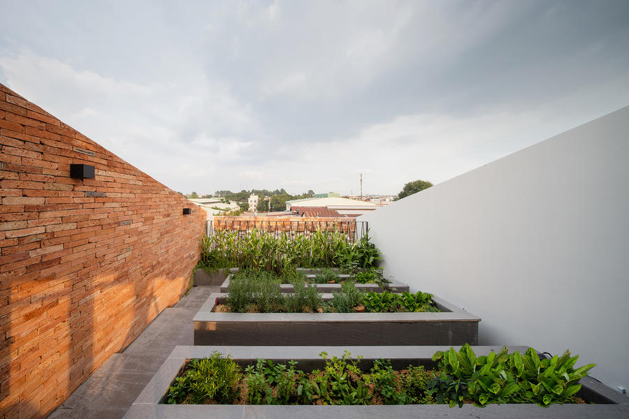 Nhà được bao phủ bởi nhiều lớp gạch và cây xanh