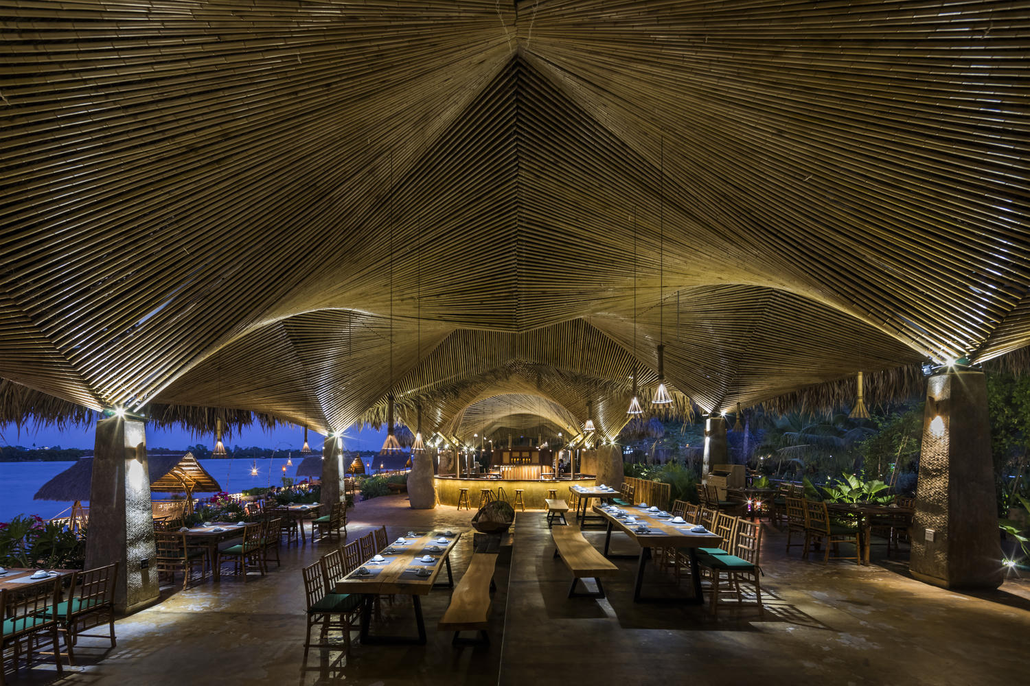 Bàn ăn đặt biệt lập dọc sông được thiết kế như những chiếc xích đu mang đến cảm giác bồng bềnh trên mặt nước. Các cột bê tông hình khối nhẹ nhàng nâng đỡ hệ thống trần tre và mái lá dừa, nâng cao tính kết hợp giữa tinh thần hiện đại và truyền thống trong thiết kế.