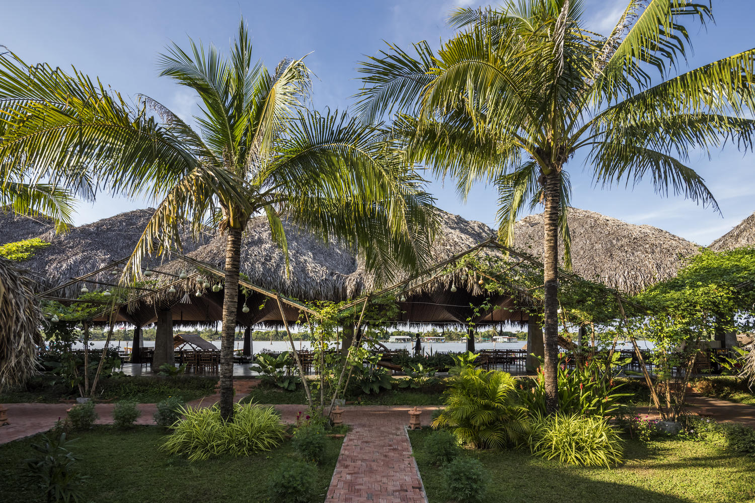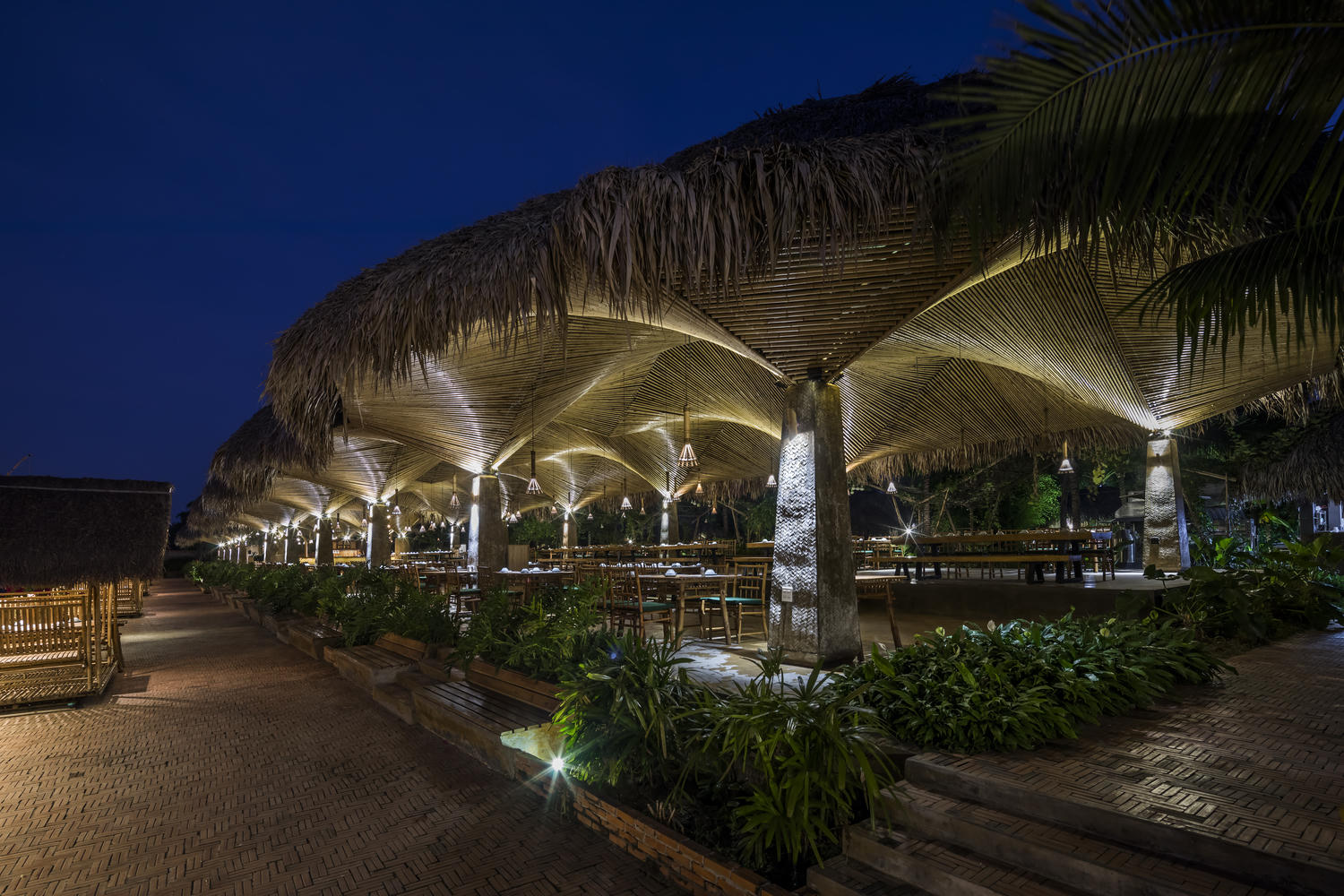 Các cột bê tông hình khối nhẹ nhàng nâng đỡ hệ thống trần tre và mái lá dừa, nâng cao tính kết hợp giữa tinh thần hiện đại và truyền thống trong thiết kế.