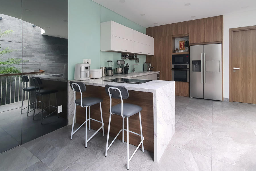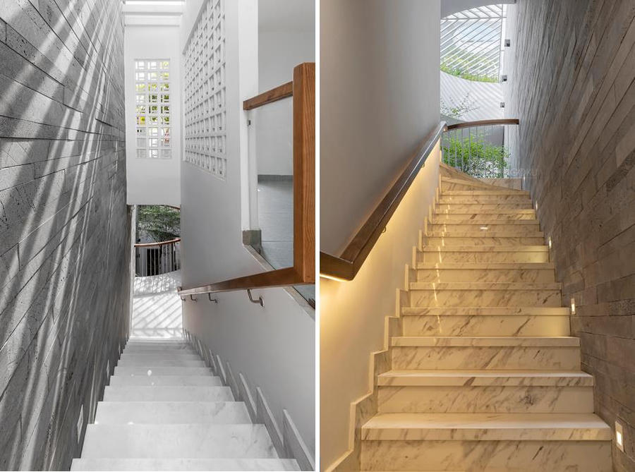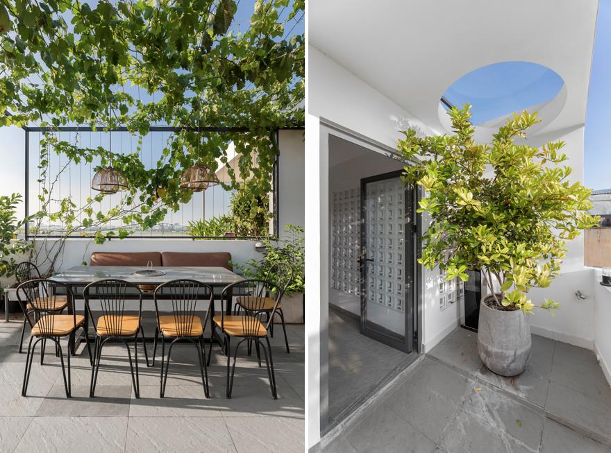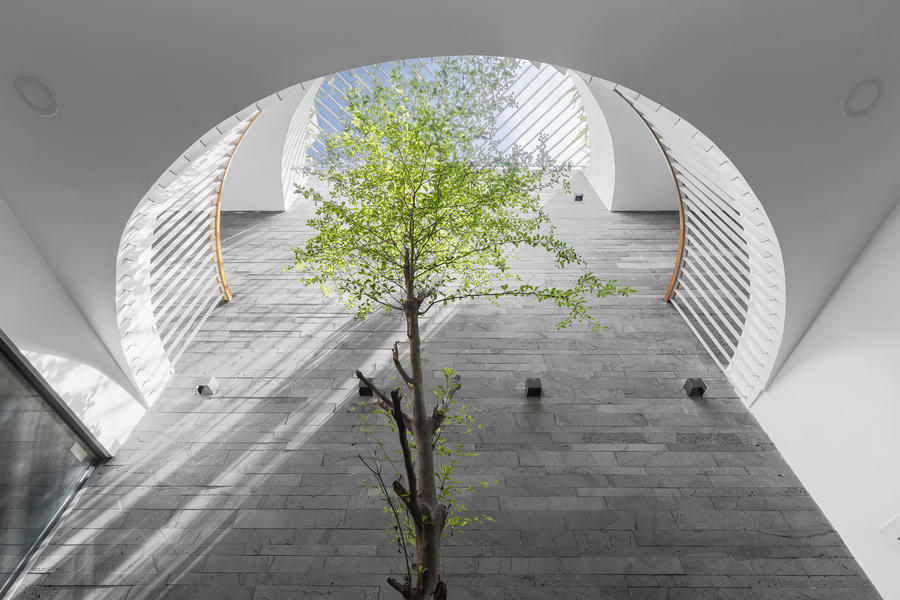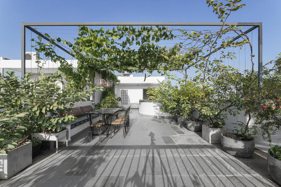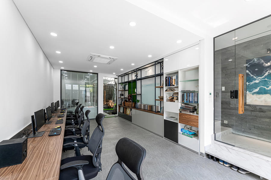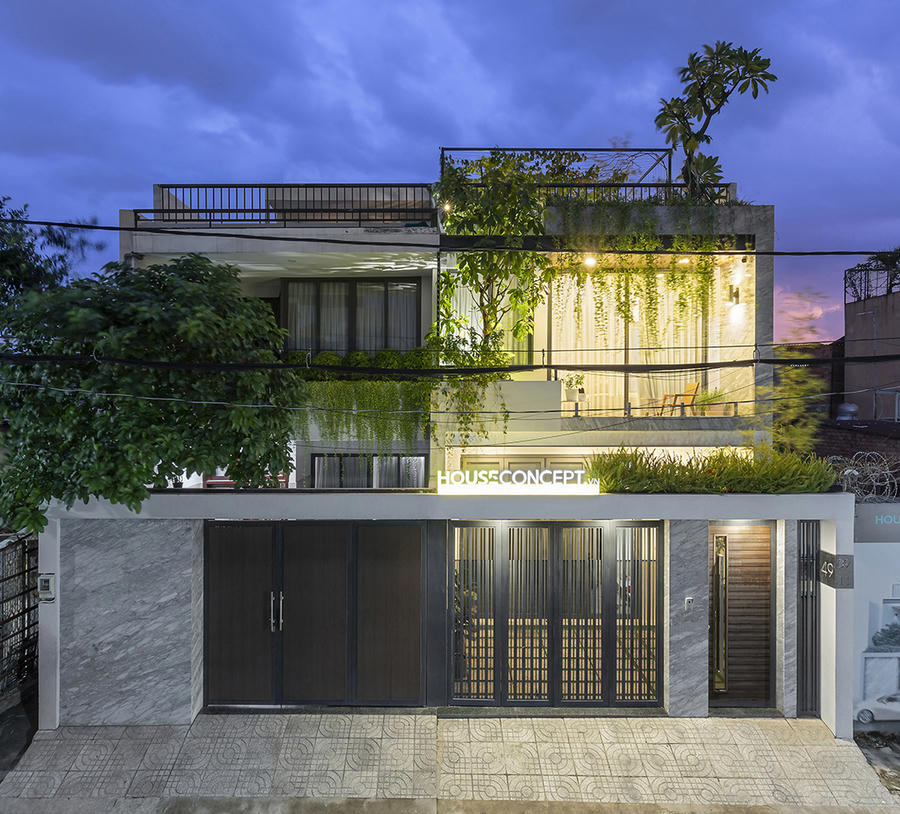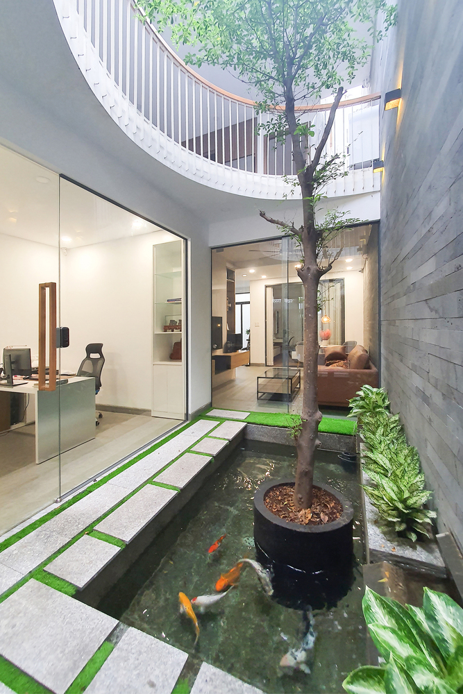 Đây là nhà ở tư nhân kiêm chức năng văn phòng - một thiết kế điển hình của khu đô thị Việt Nam. Dù mặt tiền chỉ rộng 5 m, kiến trúc sư đã khéo léo đồng bộ mặt tiền với ngôi nhà lân cận để tạo ảo giác về sự rộng rãi.Tầng một là khu làm việc của cán bộ công ty chuyên thiết kế và thi công nội thất.Mặt sau là căn hộ studio diện tích 40 m2 làm phòng trưng bày mẫu nội thất để khách hàng tham quan và cảm nhận chất lượng sản phẩm.Tầng 2 là khu vực gia đình với nhà bếp, phòng ăn và 2 phòng ngủ.Thiết kế phòng bếp được chăm chút tỉ mỉ để những làn gió trong lành thổi qua vì đây là nơi tụ họp thường xuyên của các thành viên trong gia đình. Tầng 3 là phòng thờ, góc giặt phơi và khu vườn nhỏ trồng rau quả, thu hoạch nguyên liệu xanh cho bữa ăn hàng ngày. Khách hàng mong muốn khu vườn trên sân thượng là nơi vui chơi của cả trẻ em và người lớn để tổ chức tiệc BBQ ngoài trời cùng bạn bè vào cuối tuần.Khoảng trống hình vòm ở giữa nhà là giải pháp kết nối các không gian của các tầng với nhau. Ánh sáng hỗ trợ tốt đối lưu không khí, mang nắng gió tự nhiên vào sâu cho ngôi nhà.Hồ cá koi nhỏ với tiểu cảnh nằm trực tiếp dưới giếng sáng giúp hạ nhiệt độ và cung cấp độ ẩm cho ngôi nhà.Mặc dù là một dự án đa mục đích, khách hàng mong muốn có sự phân định rạch ròi giữa không gian ở và không gian làm việc. Vì vậy, cầu thang được bố trí ngay cạnh cửa ngăn cách lối đi lại của các thành viên trong gia đình và nhân viên công ty. Lô gia được trang trí bằng “tấm rèm tự nhiên” được tạo thành bởi những dây leo xanh mướt nhằm ngăn những tia nắng chiếu quá sâu vào phòng ngủ. Phong cách tối giản được khách hàng yêu cầu trong thiết kế nội thất phòng ngủ.Phong cách thiết kế không chỉ đơn giản mà còn tinh tế và hiện đại. Không cần quá trang trí không gian với nội thất và vật dụng trang trí nhưng những yêu cầu về công năng sử dụng và yếu tố thẩm mỹ vẫn được đáp ứng đầy đủ. Nó tạo nên một không gian hài hòa vô cùng thông thoáng và rộng rãi.Góc nghỉ ngơi nhỏ mang lại cảm giác bình yên cho ngôi nhà. Ánh nắng mặt trời nhảy múa suốt một ngày được kết hợp với hệ thống khung bảo vệ hoặc lan can sắt tạo nên những bóng đổ với nhiều hình thù khác nhau trên bề mặt tường và sàn. Ngôi nhà thực sự trở thành nơi bình yên để về mỗi ngày.