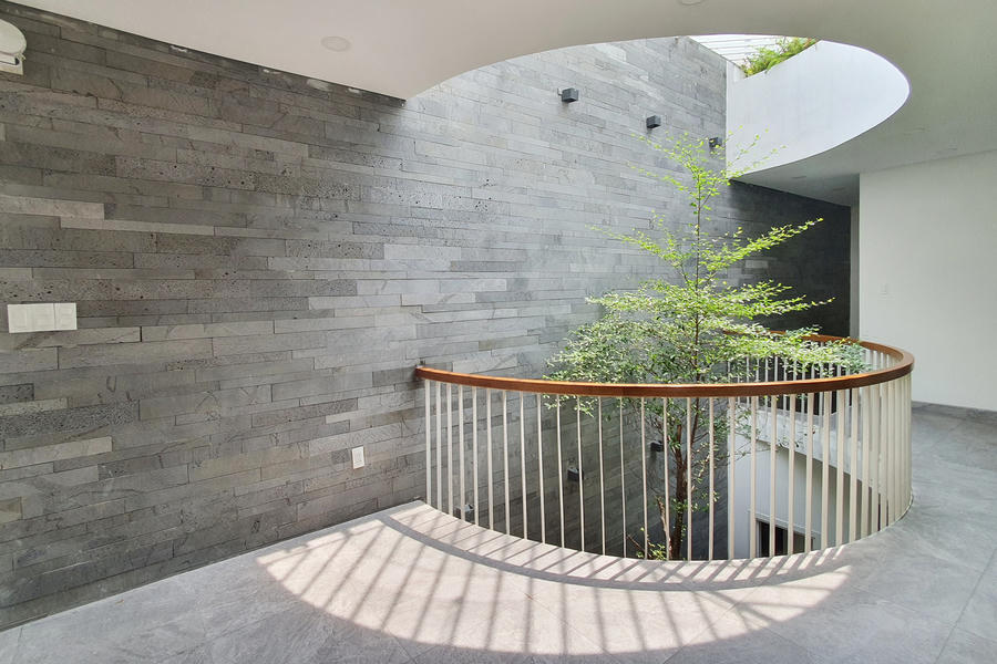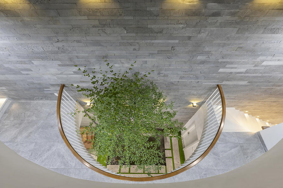 Kiến trúc sư đã khéo léo đồng bộ mặt tiền với ngôi nhà lân cận để tạo ảo giác về sự rộng rãi. Khoảng trống hình vòm ở giữa nhà là giải pháp kết nối các không gian của các tầng với nhau.