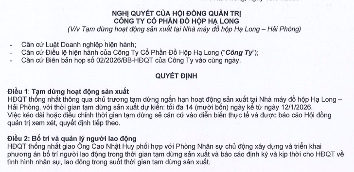 CTCP Đồ hộp Hạ Long quyết định tạm dừng sản xuất nhà máy tại Hải Phòng trong 14 ngày kể từ 12/1/2026 và có thể dài hơn căn cứ theo tình hình thực tế.