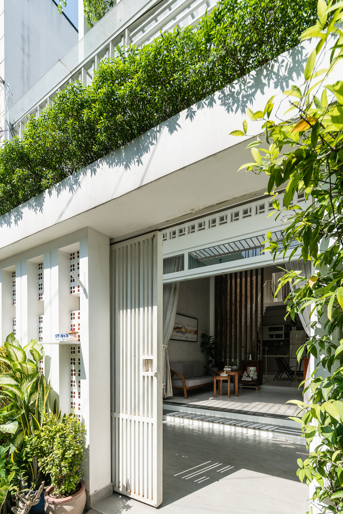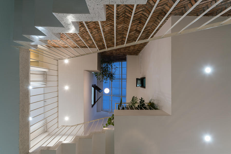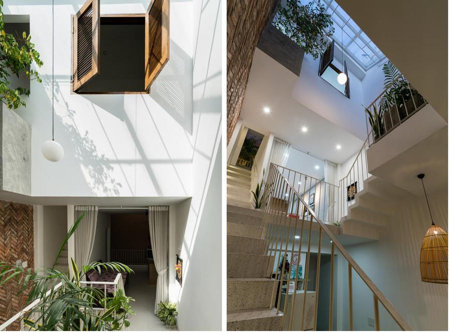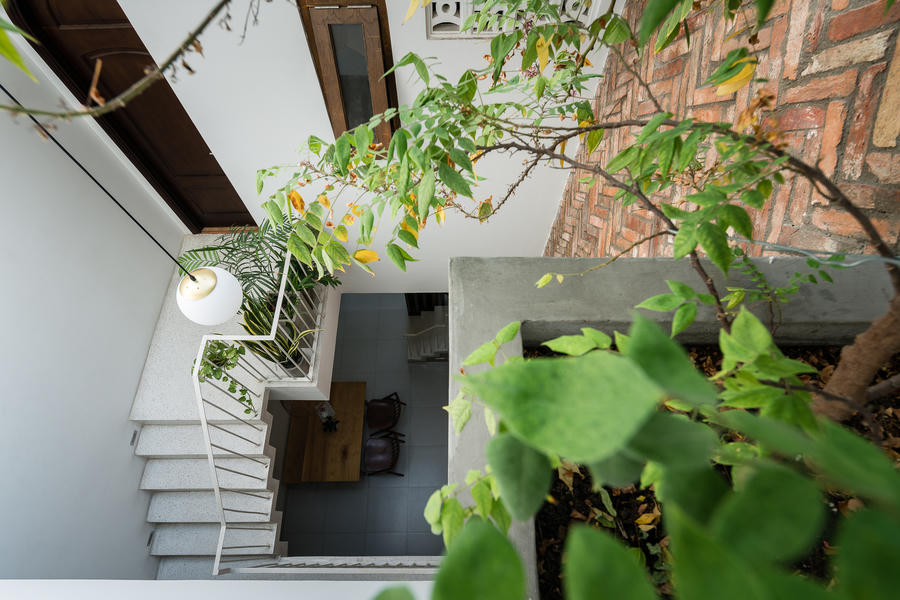 Cầu thang được thiết kế dưới gầm cầu thang, bàn ăn được đặt thẳng dưới giếng trời để tối đa hóa ánh sáng và lưu thông gió qua bên trong. Toàn bộ công trình được sơn màu trắng tạo cảm giác thông thoáng, thêm một chút gạch thô để tạo điểm nhấn, tăng tính tương phản.