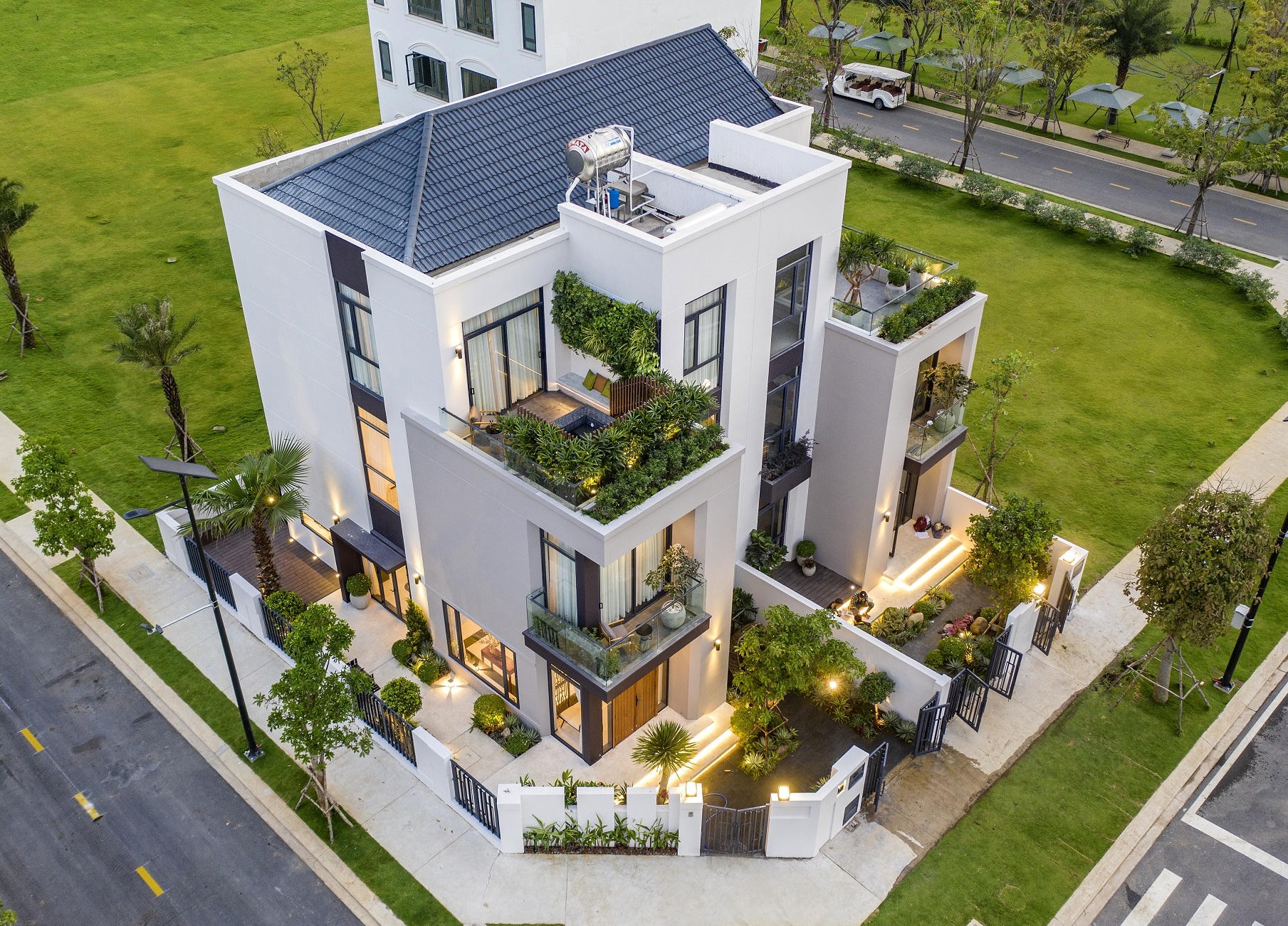 Giá trị vượt trội của mô hình “Song gia tuyệt tác” còn đến từ tính ưu việt trong thiết kế không gian sống. Khoảng sân vườn trước, sau nhà hay sân thượng rộng thoáng được thiết kế linh hoạt, tuỳ theo mong muốn của gia chủ mà hai căn nhà có thể bố trí thông nhau. Điểm nhấn này rất thuận tiện cho những đại gia đình, anh em, bạn bè muốn sống gần nhau,vừa thân thiết lại đủ riêng tư khi tách biệt với các căn còn lại.