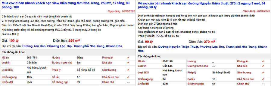 Cá biệt hơn, có trường hợp một môi giới bất động sản đã đăng một lúc 5 khách sạn cần rao bán trong đó có cả khách sạn 4 sao nằm trung tâm TP Nha Trang với diện tích 210 m2 gồm 100 phòng với giá 145 tỷ đồng; một khách sạn 3 sao mặt tiền khu phố Tây rộng gần 300 m2 mới xây dựng với 88 phòng được rao giá 160 tỷ đồng; một khách sạn 3 sao ở đường Phạm Văn Động rộng 242 m2 gồm 87 phòng cũng được rao 148 tỷ đồng….