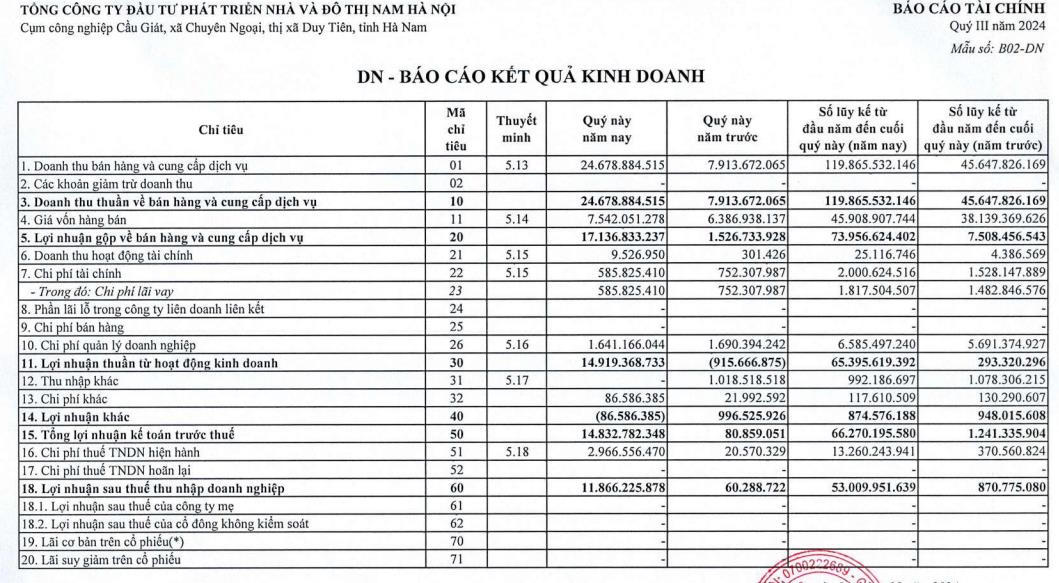 Luỹ kế trong 9 tháng năm 2024, Nhà và Đô thị Nam Hà Nội ghi nhận doanh thu đạt 119,8 tỷ đồng, tăng 162,6% so với cùng kỳ. Lợi nhuận sau thuế đạt 53,01 tỷ đồng so với cùng kỳ lãi 0,87 tỷ đồng, tăng 52,14 tỷ đồng.