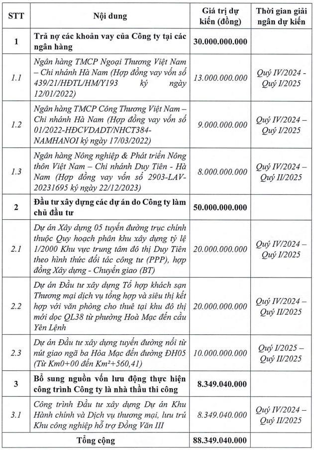 Với số tiền huy động được, Công ty dự kiến dùng 50 tỷ đồng để đầu tư xây dựng các dự án do Công ty làm chủ đầu tư; 30 tỷ đồng thực hiện chi trả các khoản nợ; và còn lại hơn 8 tỷ đồng để bổ sung nguồn vốn lưu động.