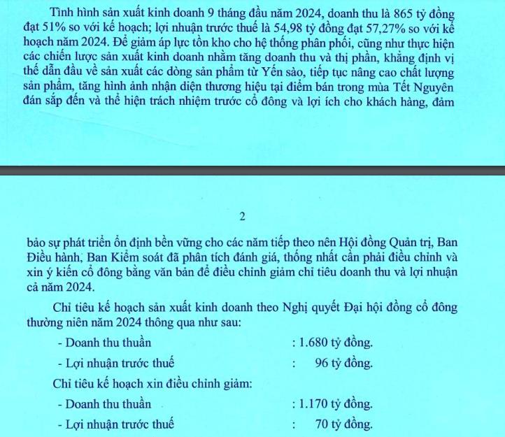 SKH cho biết, đề xuất này đưa ra nhằm giảm áp lực tồn kho cho hệ thống phân phối cũng như thực hiện chiến lược kinh doanh nhằm tăng doanh thu, thị phần, khẳng định vị thế dẫn đầu về sản xuất dòng sản phẩm từ Yến sào, nâng cao chất lượng sản phẩm, tăng hình ảnh nhận diện thương hiệu tại điểm bán trong mùa Tết Nguyên đán sắp đến và thể hiện trách nhiệm trước cổ đông, lợi ích cho khách hàng, đảm bảo sự phát triển ổn định bền vững cho năm tiếp theo nên Hội đồng quản trị, ban điều hành, ban kiểm soát đã đánh giá phân tích, thống nhất điều chỉnh và xin ý kiến cổ đông bằng văn bản điều chỉnh giảm chi tiêu doanh thu và lợi nhuận năm 2024.