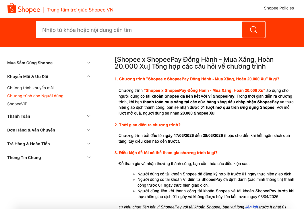 Theo đó, người dùng mua xăng, dầu với hóa đơn từ 20.000 đồng trở lên và thanh toán qua ShopeePay tại các trạm xăng hợp lệ sẽ được hoàn 20.000 đồng dưới dạng Shopee Xu vào tài khoản, tối đa 1 lần/người/ngày. Khoản hoàn này có thể tiếp tục được sử dụng trong hệ sinh thái mua sắm trên Shopee, qua đó gián tiếp giảm chi tiêu hàng ngày của người dùng.
