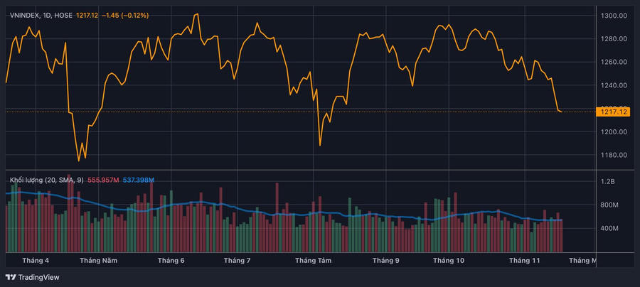 Áp lực cung dâng cao khiến VN-Index có thời điểm lùi sát ngưỡng 1.200 điểm trước khi "hồi" trở lại về cuối phiên. VN-Index đóng cửa phiên 18/11 giảm 1,45 điểm tại mốc 1.217 điểm. Nhìn xa hơn chỉ số đã mất gần 75 điểm (~ 6%) kể từ vùng điểm cao thiết lập vào hồi đầu tháng 10. Giảm sâu từ đỉnh, liệu đáy chứng khoán đã dần lộ diện?