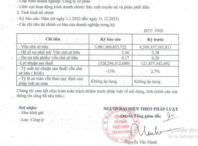 Nhiệt điện Thăng Long đính chính báo cáo tài chính, năm 2023 lỗ nặng hơn 528 tỷ đồng
