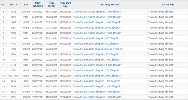 Một doanh nghiệp khác có truyền thống chi trả cổ tức vào dịp đầu năm âm lịch là Công viên nước Đầm Sen (mã CK: DSN). Năm nay, công ty sẽ chốt danh sách cổ đông nhận cổ tức năm 2020 bằng tiền với tỷ lệ 25% vào ngày 1/3 và dự kiến sẽ thanh toán vào ngày 15/3/2021. Số tiền dự chi cho đợt cổ tức lần này vào khoảng 30 tỷ đồng.