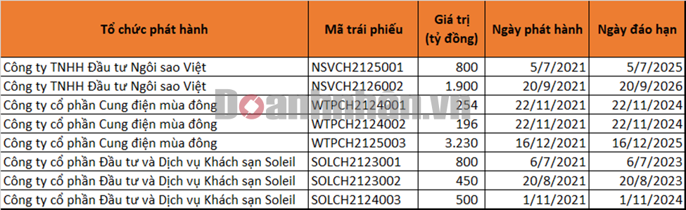 Theo thông tin trên HNX, trong năm 2021, nhóm công ty này đã phát hành 8 lô trái phiếu có tổng trị giá 8.130 tỷ đồng. Trong số các lô đã được công bố, Ngôi Sao Việt có 2 lô tổng giá trị 2.700 tỷ đồng; Cung Điện Mùa Đông có 3 lô tổng giá trị 3.630 tỷ và Khách sạn Soleil có 3 lô trị giá 1.750 tỷ đồng. Nhiều khả năng nhóm công ty này có thêm 1 đợt phát hành nữa trị giá 1.900 tỷ đồng đầu năm 2022 hiện chưa được công bố.