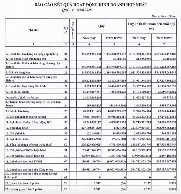 Tính chung cả năm 2025, doanh thu thuần của doanh nghiệp đạt 3.103 tỷ đồng, lợi nhuận ròng đạt 304,7 tỷ đồng.
